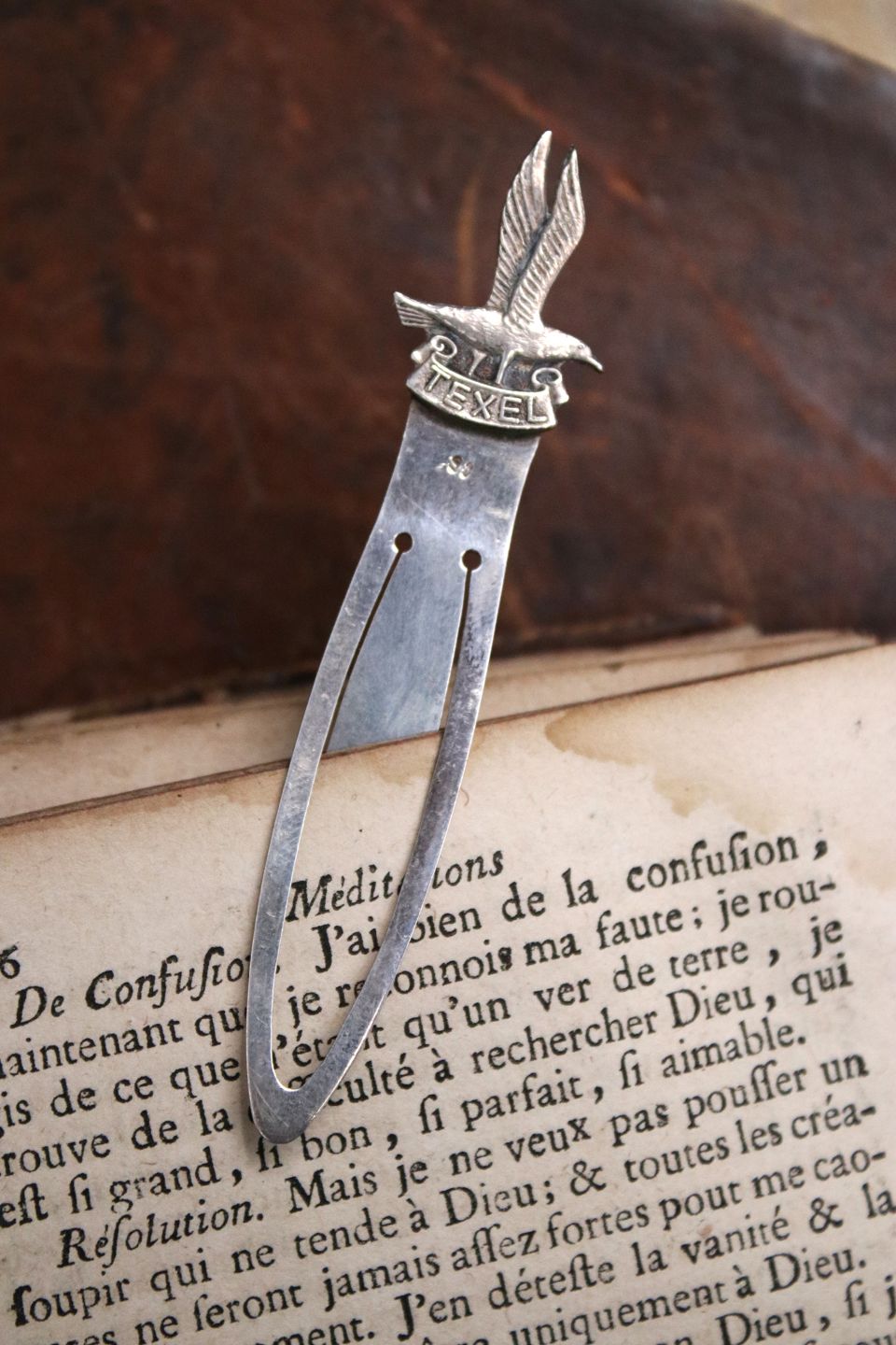 Gammelt bogmærke i sølv (stemplet) Længde 8,5cm. med fuglemotiv og tekst "Texel" som er navnet på en Hollandsk vadehavs ø som er kendt sin fantastiske natur og store dyre og fugleliv.