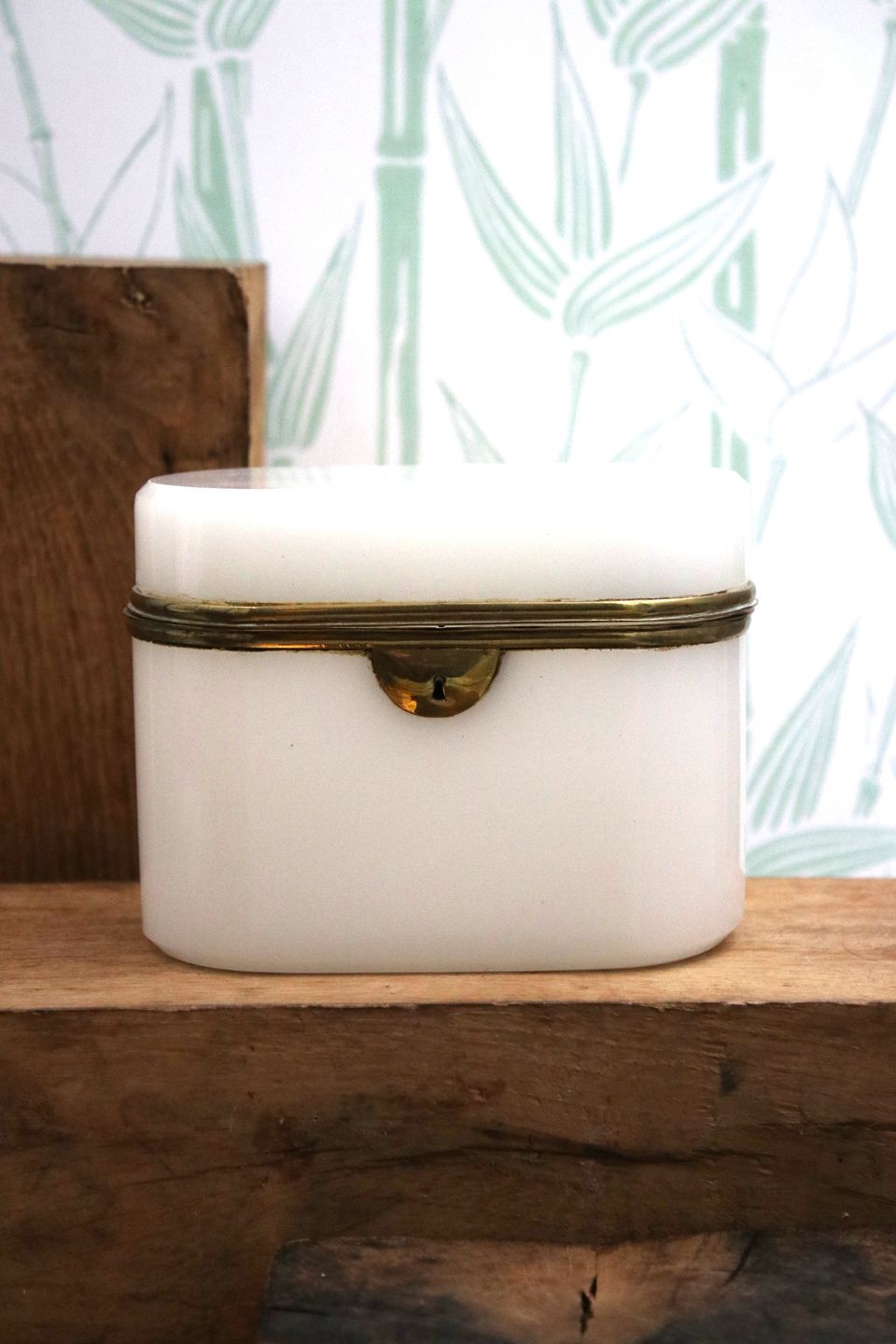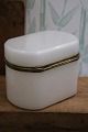 Antikt 1800 tals sukkerskrin i hvid opal glas med bronze montering. H: 10,2cm. L&B: 14,5x10cm. Emne nummer: Sukkerskrin nr.2