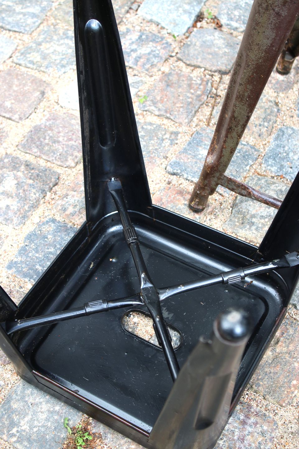 Original gammel fransk Tolix taburet i sortmalet metal med fin patina. H: 45cm. Top 31x31cm. Bund 40x40cm.