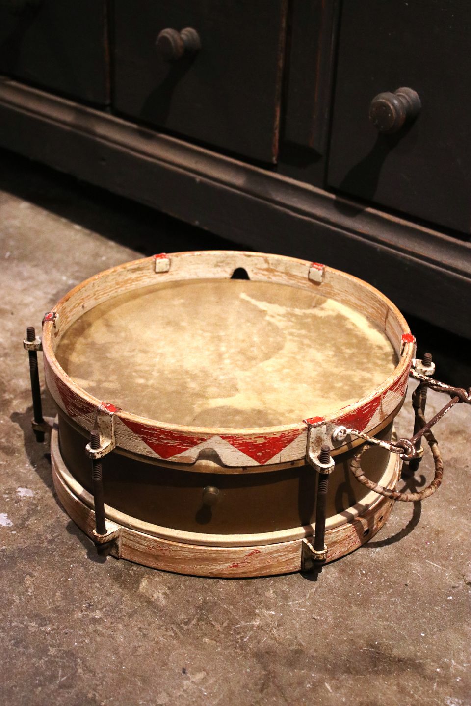 Dekorativ , gammel tromme i messing med malet træ kanter (Rød / Hvid) og har en rigtig fin patina. H: 14cm. Dia.: 35cm. Emne nummer: Tromme nr.4