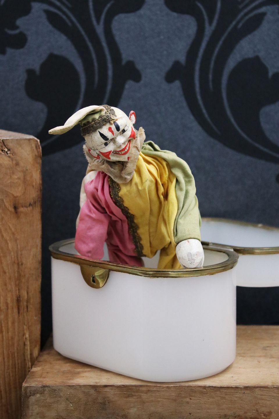 Klovnen har en rigtig fin patina , har bevægelige arme og ben.