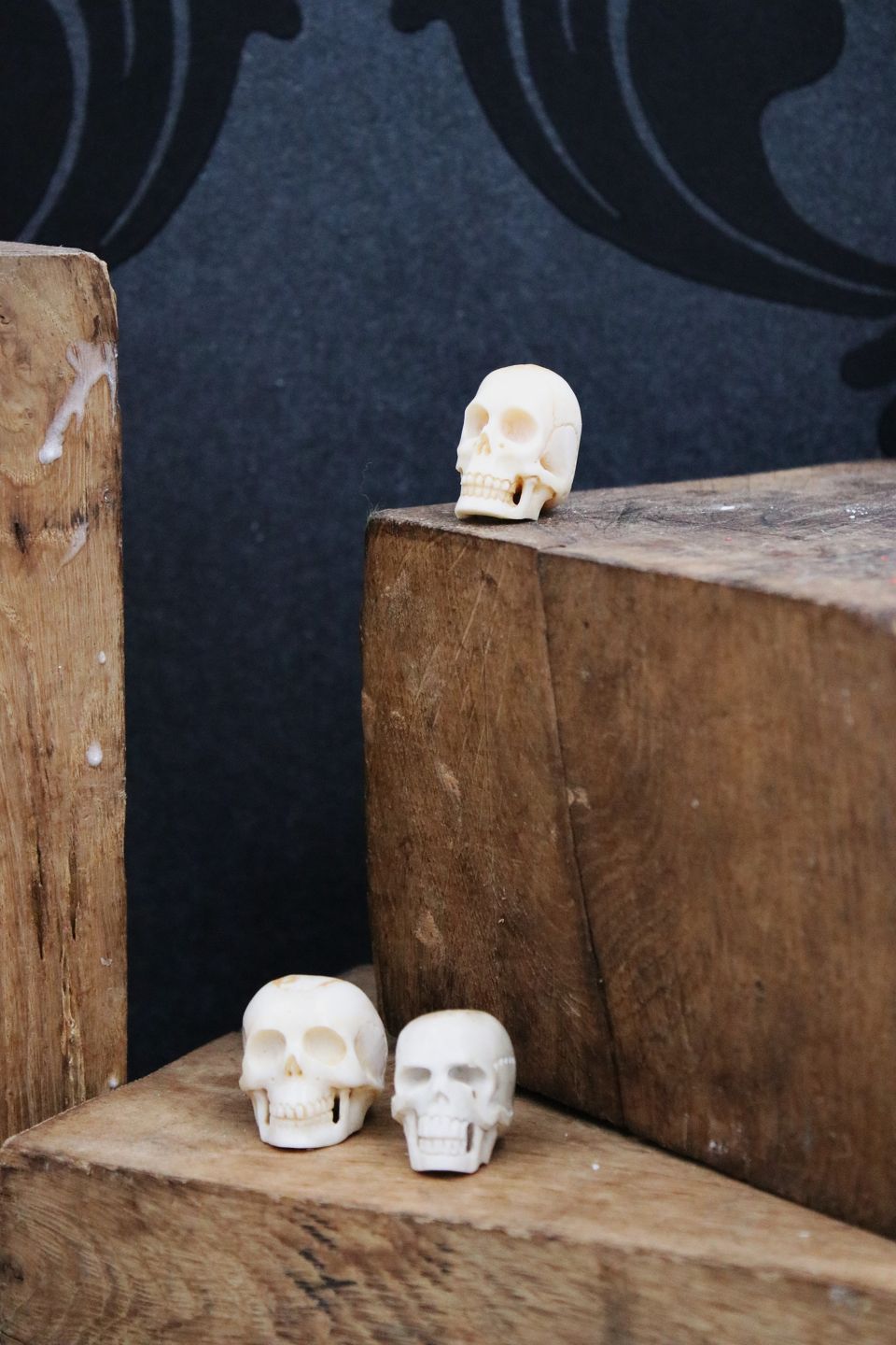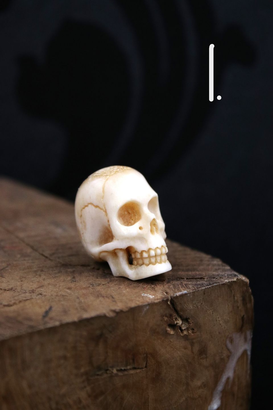 Gamle, dekorative mini kranier udskåret i horn / ben. Ca. højde: 2,6-2,8cm. Emne nummer: Mini kranier