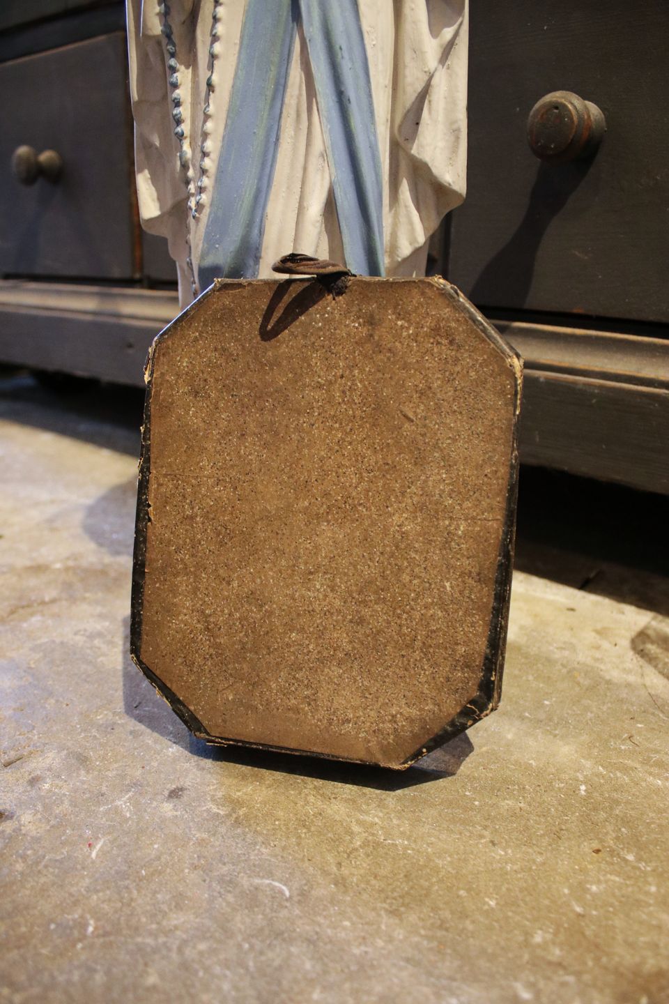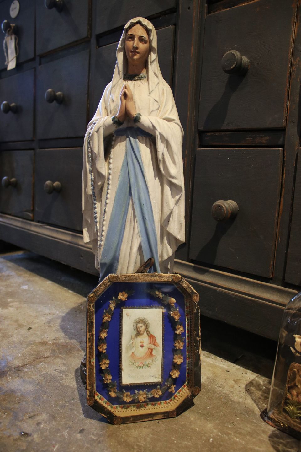 Dekorativt , gammelt religiøst billede ( med glas ) med Jesus billede og fin blomster krans i stof. Måler: 20,5 x 16,5cm. Dybde: 3cm.