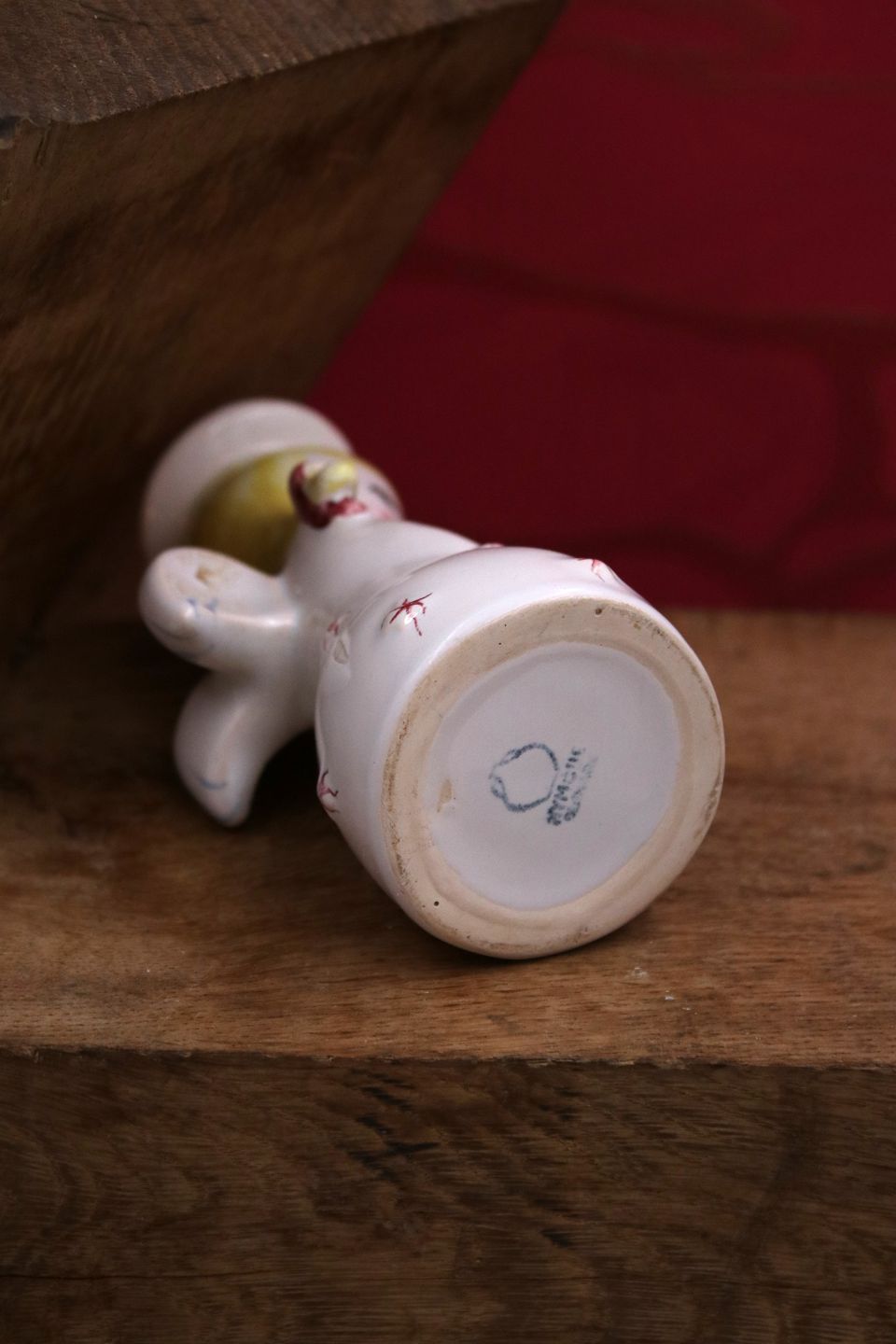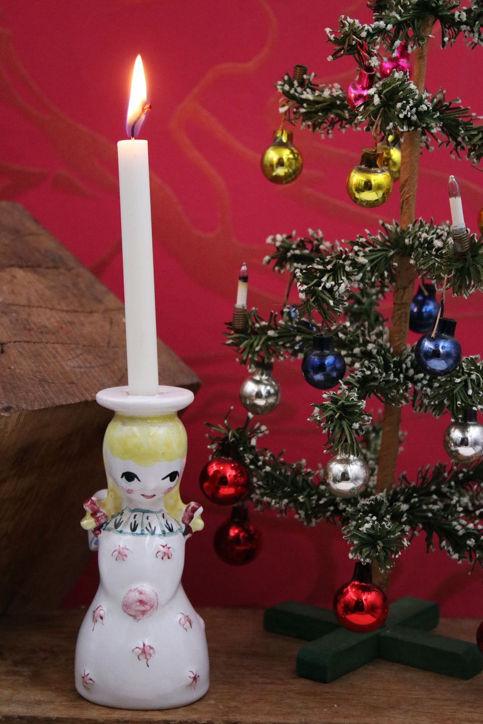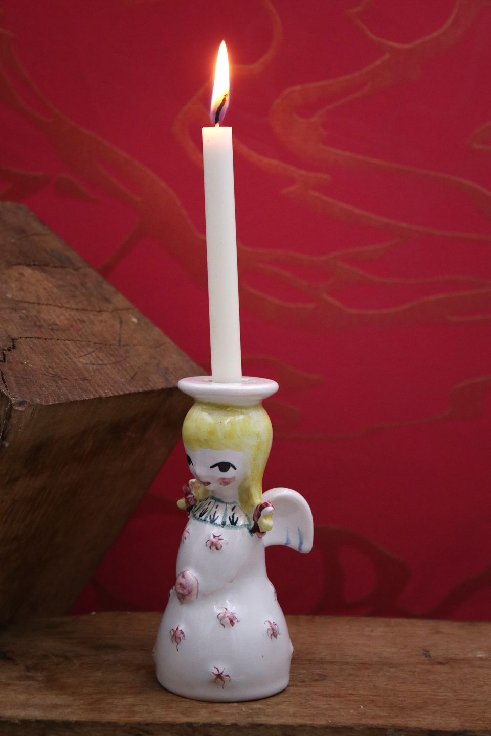 Nymølle jule engel med gult hår i fajance med plads til lille grangren eller stearinlys i toppen. H: 12cm. Emne nummer: Nymølle engel 2