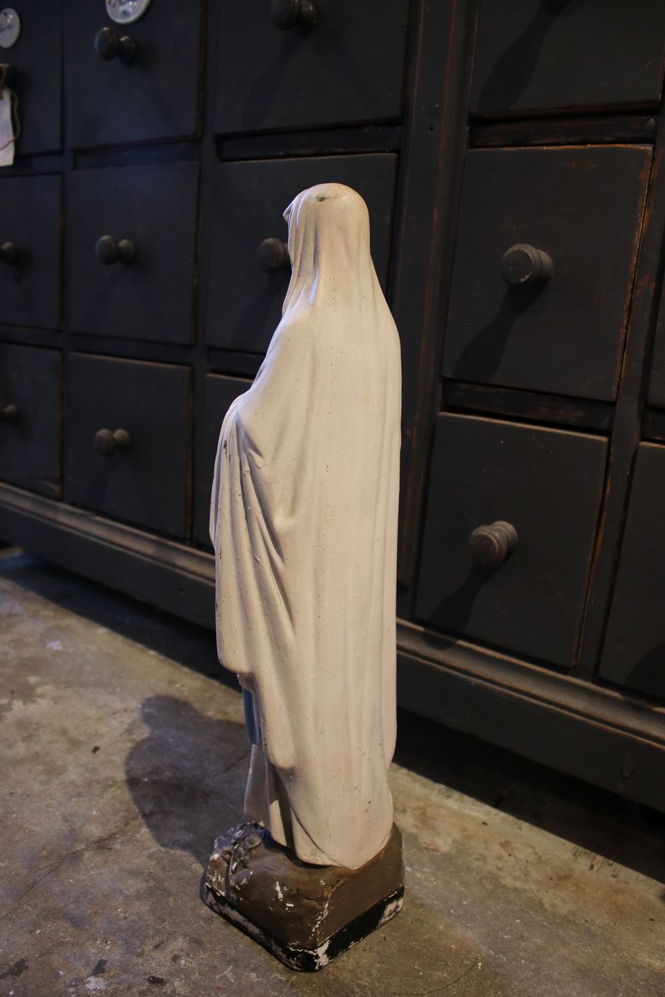 Fin , gammel fransk Madonna figur i bemalet gips med en fin gammel patina. Højde: 56cm.