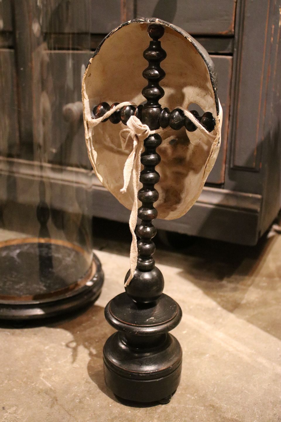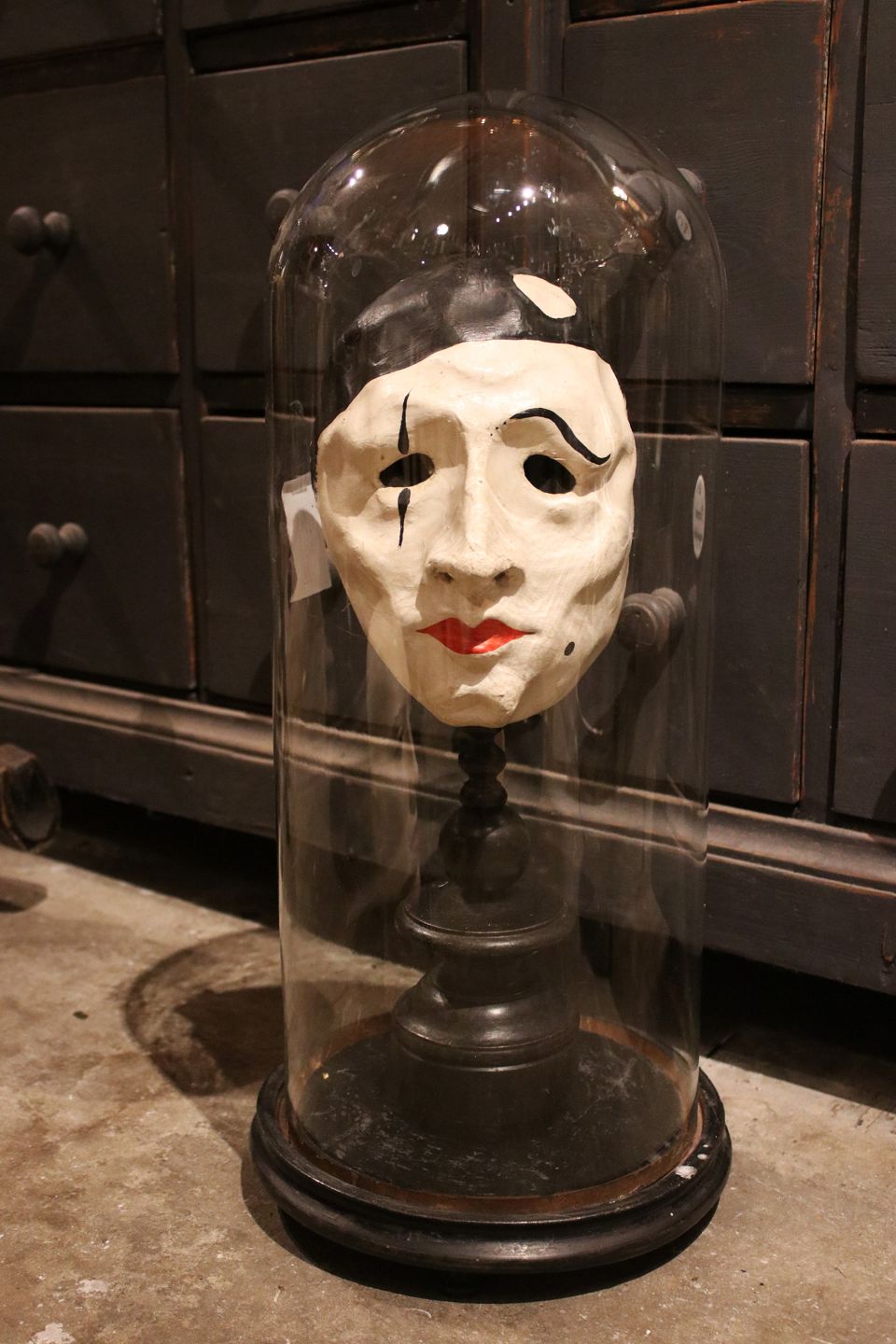 Dekorativ , gammel klovnemaske i bemalet papmache monteret på gammel sortmalet træ fod. H: 44cm. B: 16cm. Emne nummer: Klovnemaske