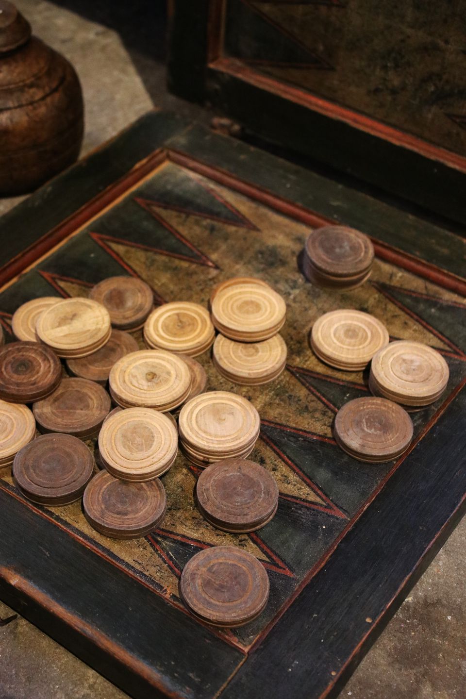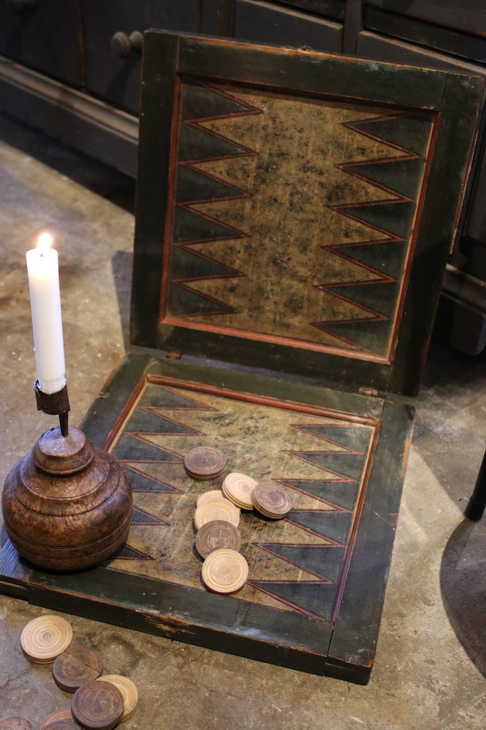 Charmerende antik 1800 tals spilleæske / brætspil i bemalet træ med 3 forskellige spil. Har en super fin patina.