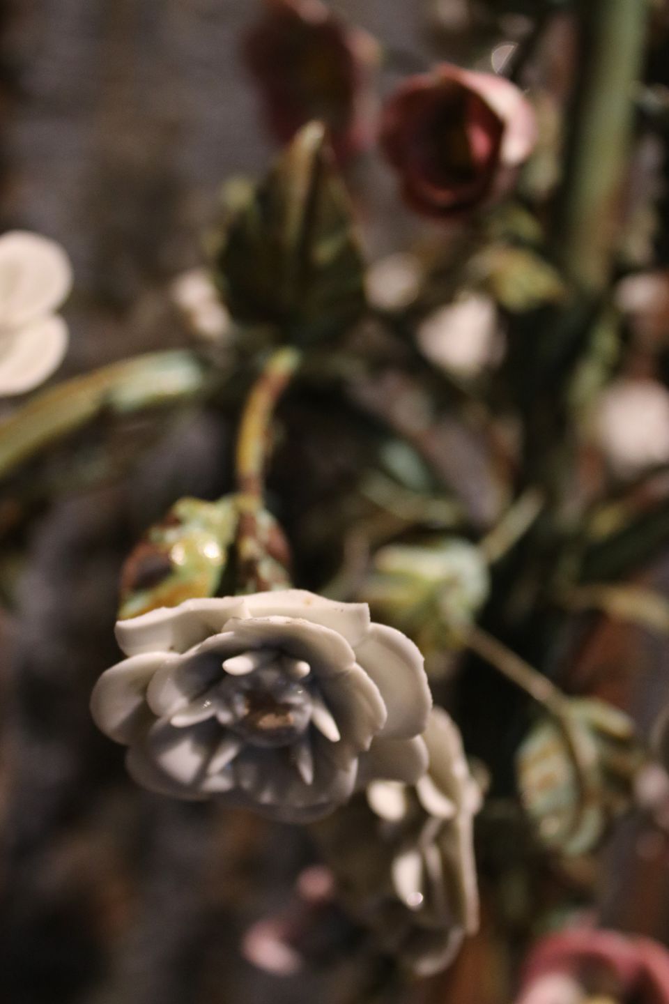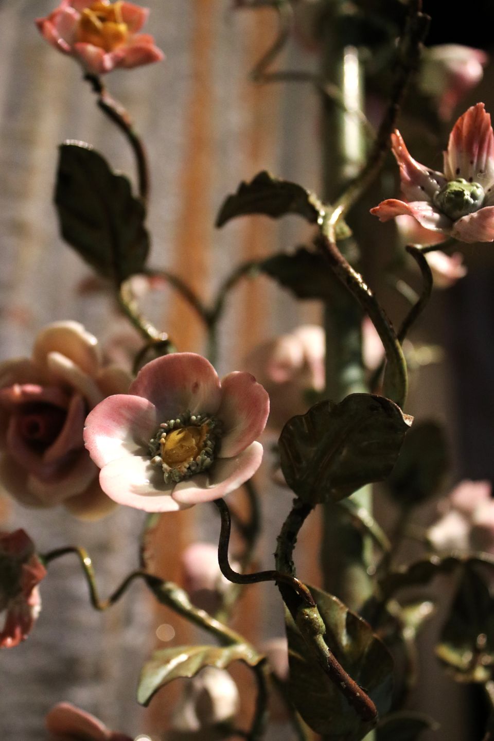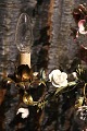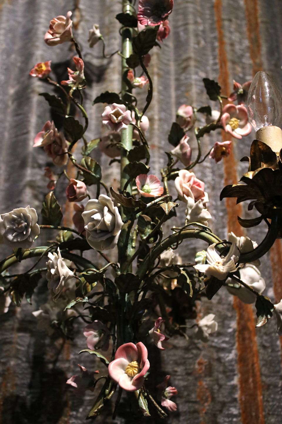 Gammel fransk lysekrone med base i grønmalet metal stel dekoreret med en masse små fine farvet / hvide porcelænsblomster.