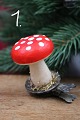 Gammel juletræspynt i form af julesvamp (rød fluesvamp) lavet i presset vat som sidder på gammel metal clips.