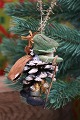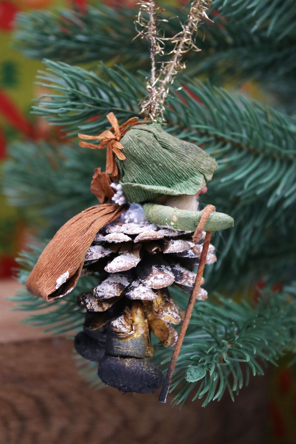 Gammel juletræspynt i form af nisse med stok og rygsæk lavet af grankogle , vat , krep papir og ansigt i papmache. Højde: 9cm. Emne nummer: Jul nr.661