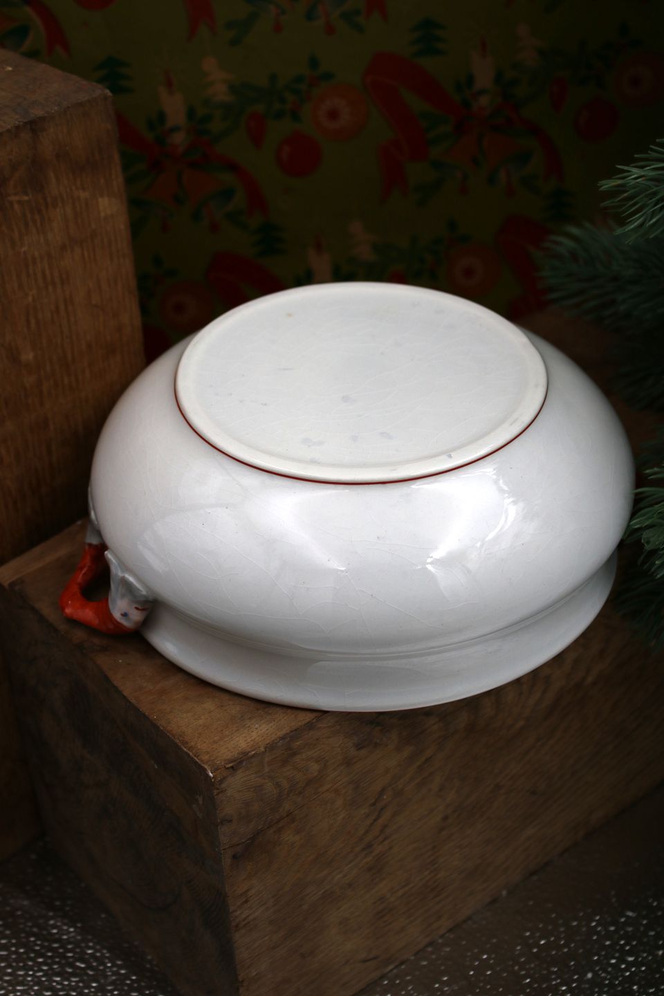 Gammel svensk juleskål i fajance med nisse på hankene. H: 7,5 cm. Dia.: 20cm. Emne nummer: Svensk juleskål