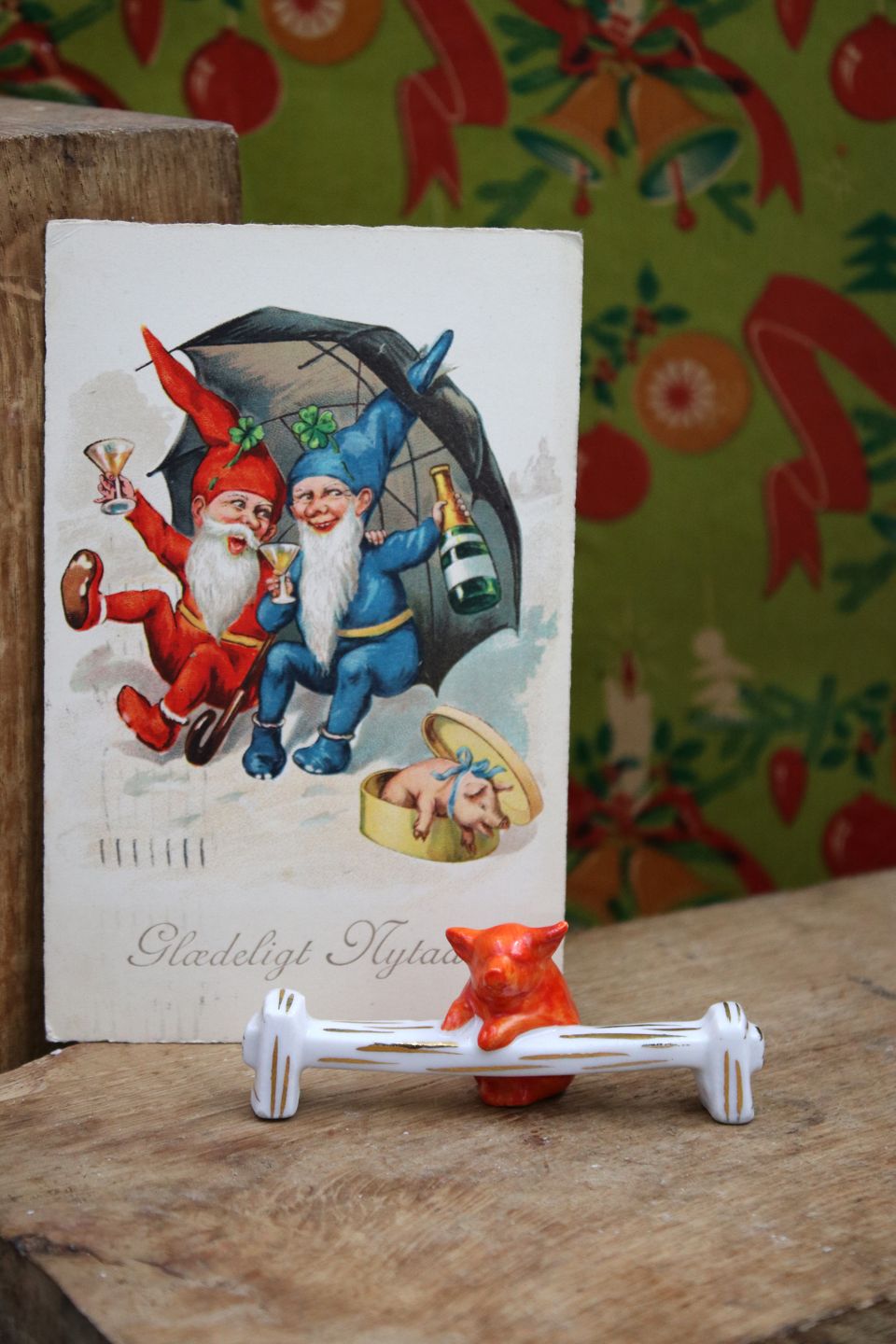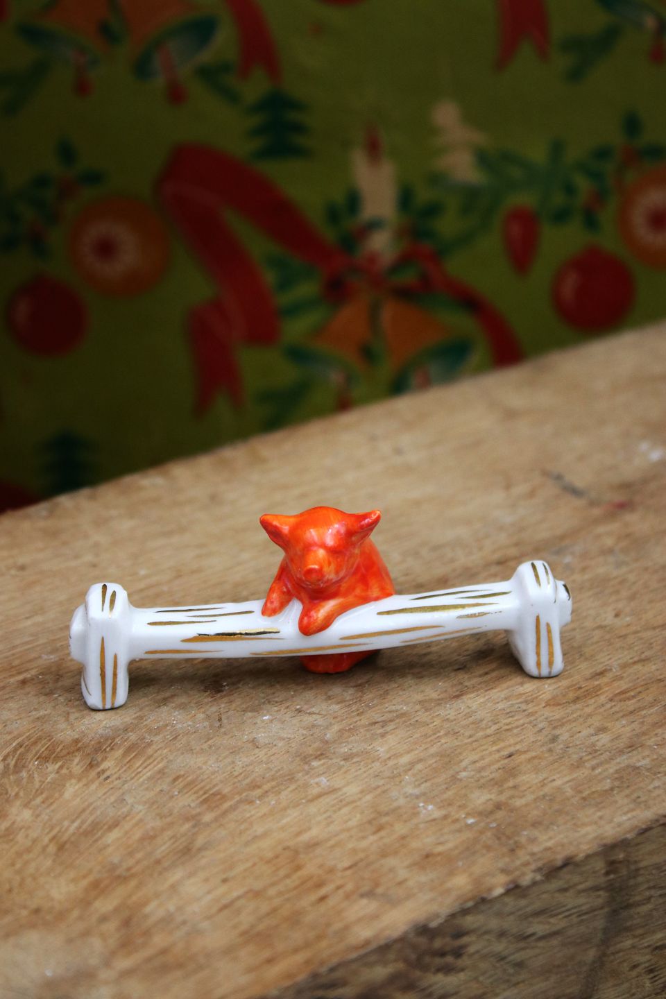 Gammel jule knivstol i porcelæn i form af gris på træstamme til at lægge sit bestik på. H: 3,5cm. L: 8,5cm. Emne nummer: Jule knivstol nr.1