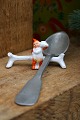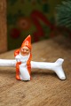 Gamle svenske jule knivstol i porcelæn med lille nisse siddende på træstamme til at lægge sit bestik på.