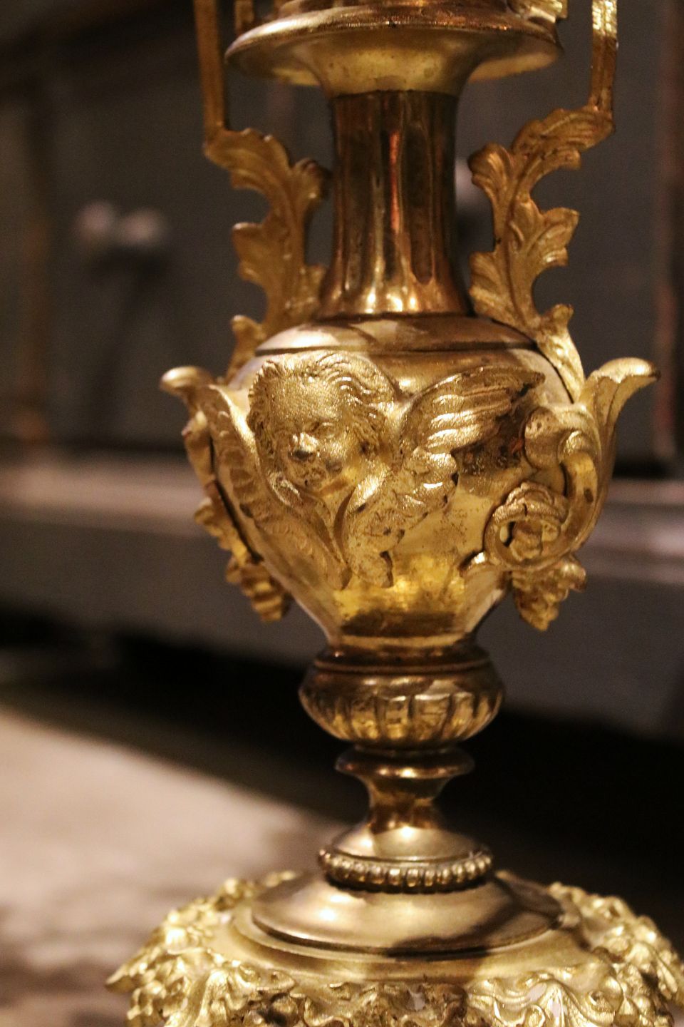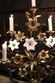 Stor flot fransk kirkelysestage i bronze , dekoreret med bronze liljer og 3 gamle hvide opaline glas liljer , samt med en meget flot fod med engel.