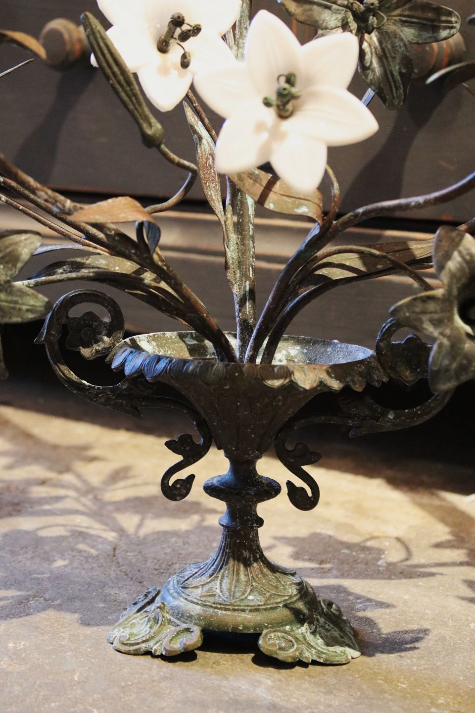 Antik fransk kirkestage i helt mørk patina , dekoreret med blandt andet 5 gamle hvide opal glas blomster og fin vase formet fod.
