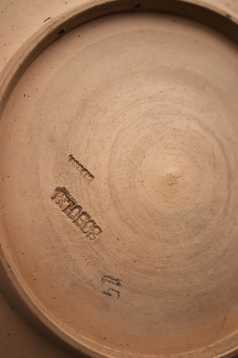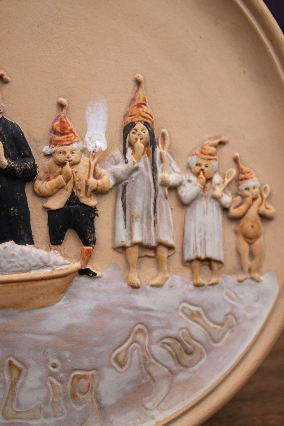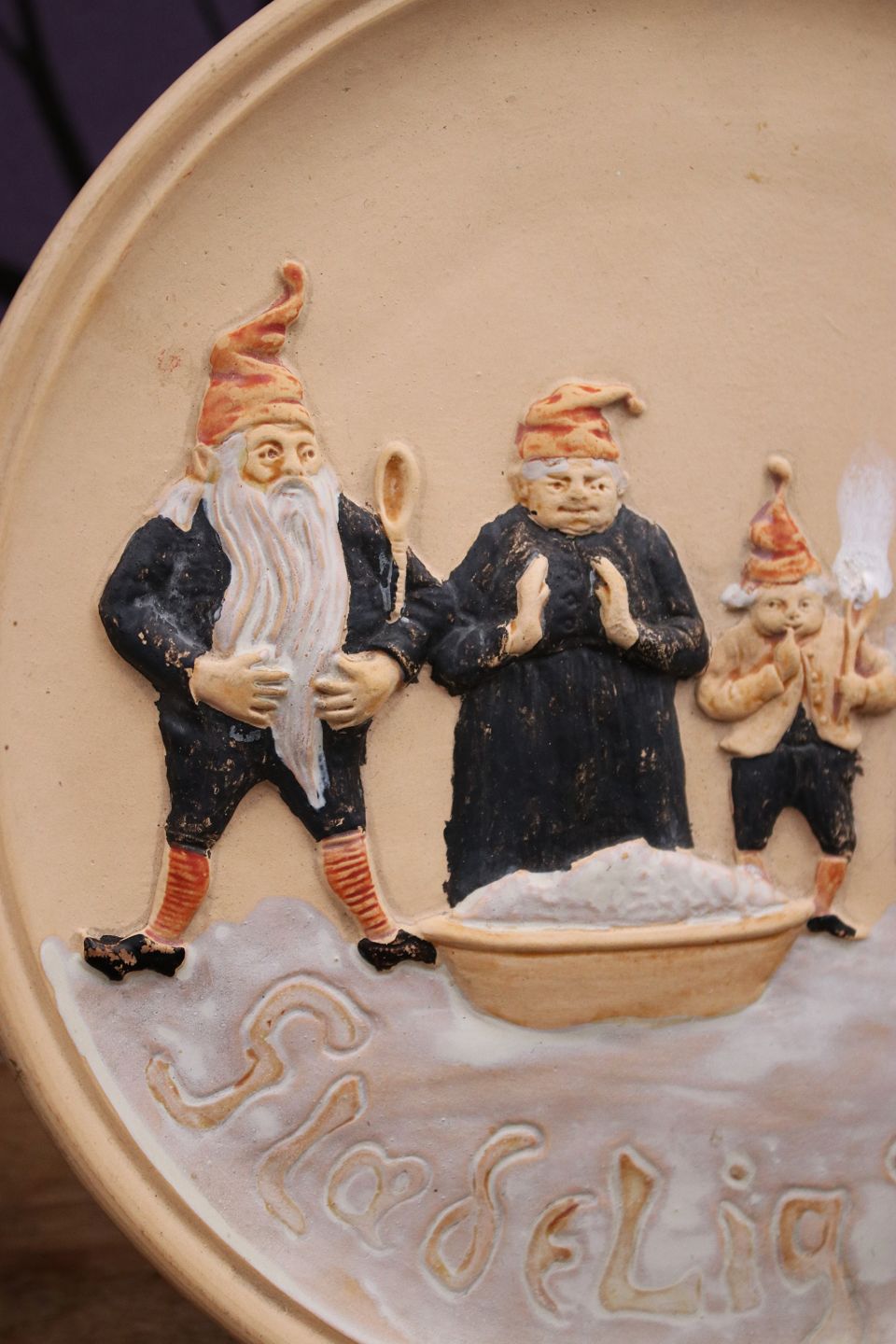 Gammel Jule platte i terrakotta med motiv af nisse familie samlet om risengråden og Glædelig jul skrevet forneden. Dia.: 18,5cm.