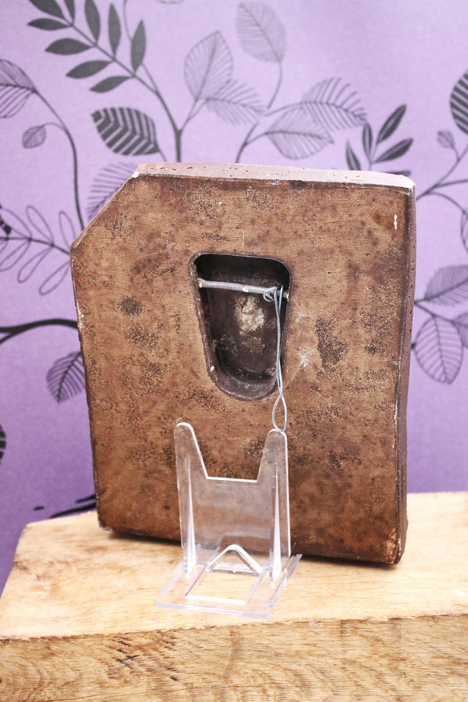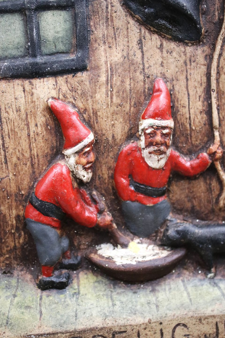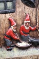 Dekorativ , gammel juledekoration / væg platte i lertøj / terrakotta med julemotiv af 2 julenisser med kat og risengrød der ringer julen ind , og med skrift forneden "Glædelig Jul"