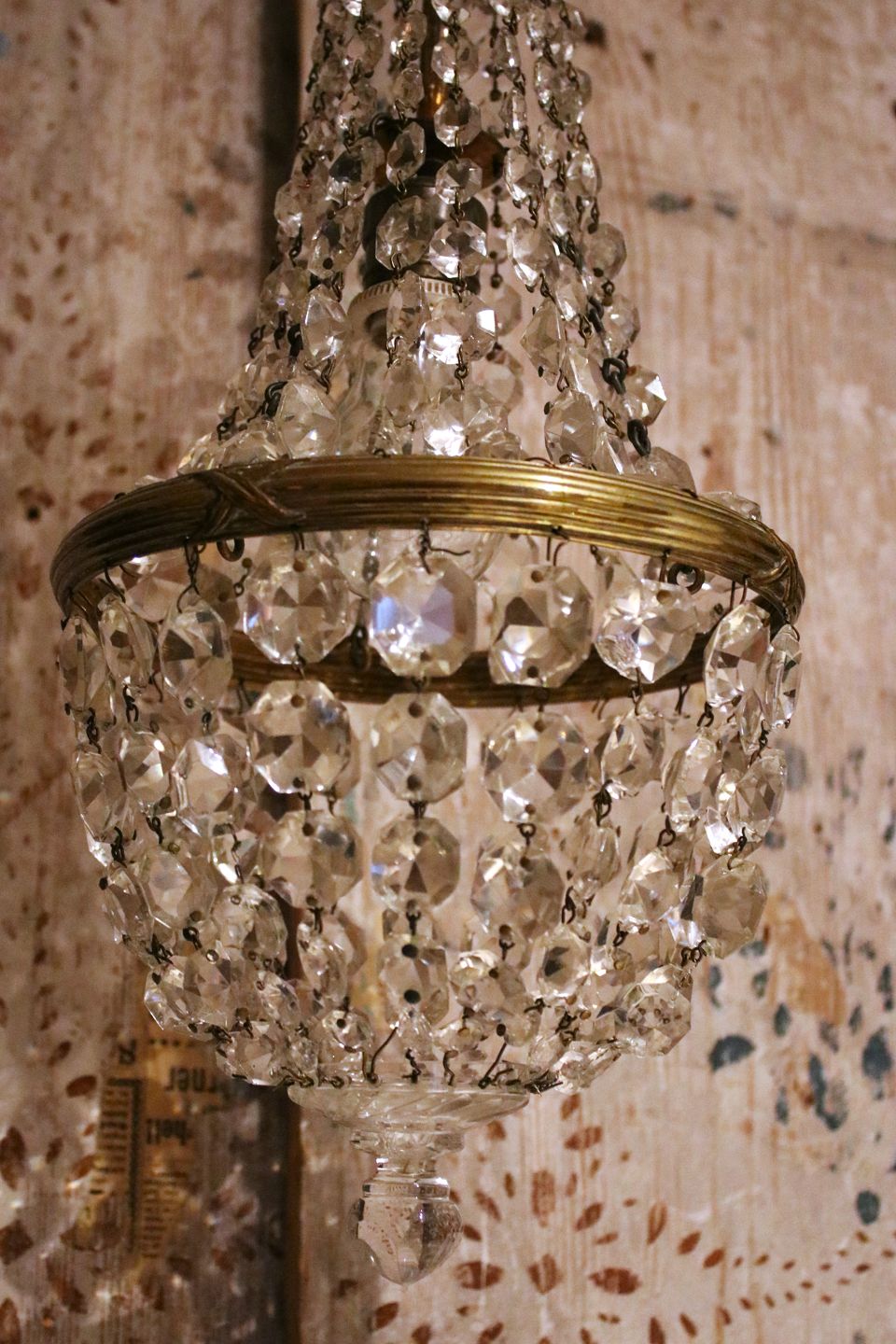 Gammel , mini prismelysekrone i bronze med klare slebne glas prismer.