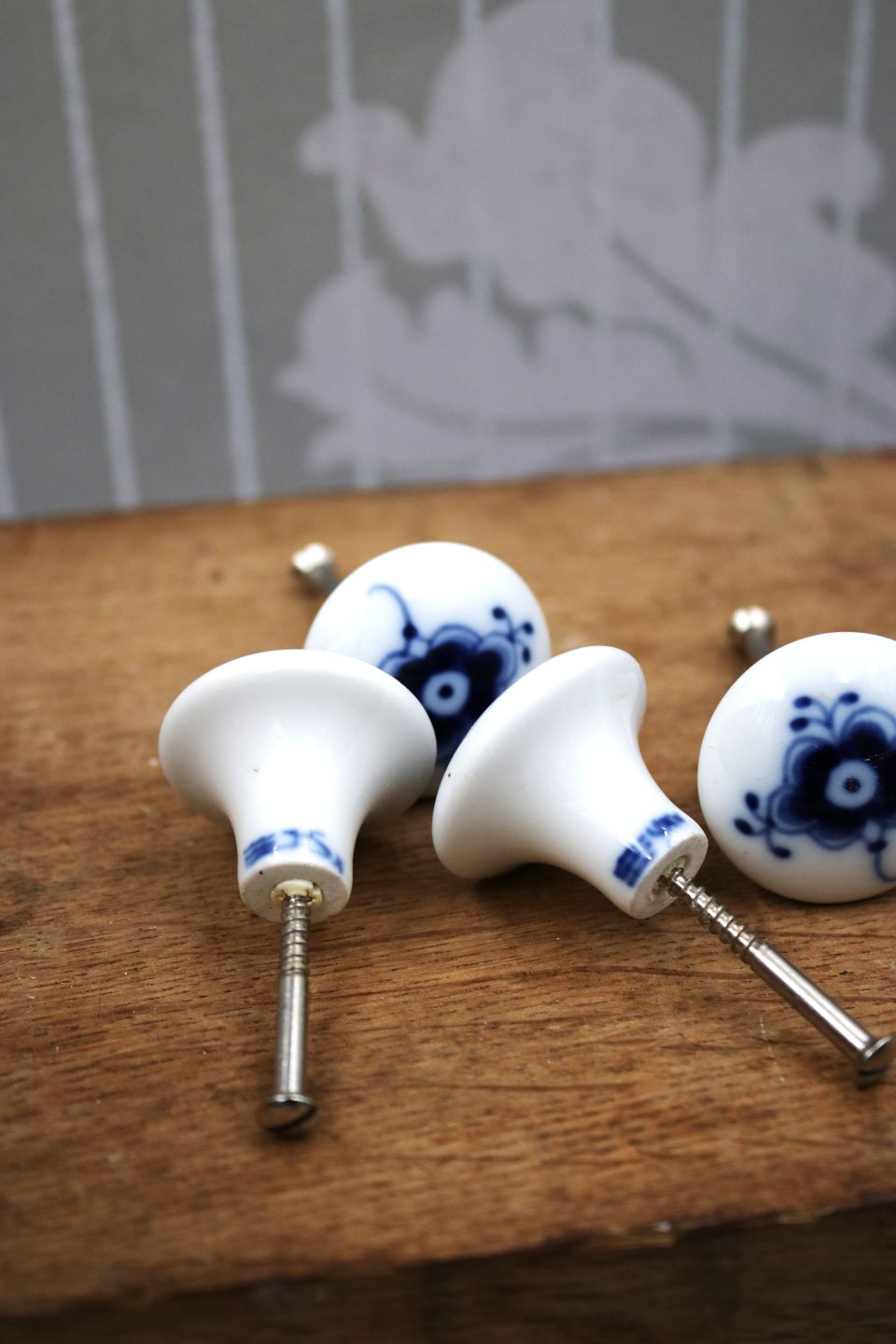 Gamle Musselmalet porcelæns greb / knopper fra Royal Copenhagen til møbler. Dia.: 3cm. D:2,3cm. (8 stk. haves på lager) Emne nummer: RC# møbel greb