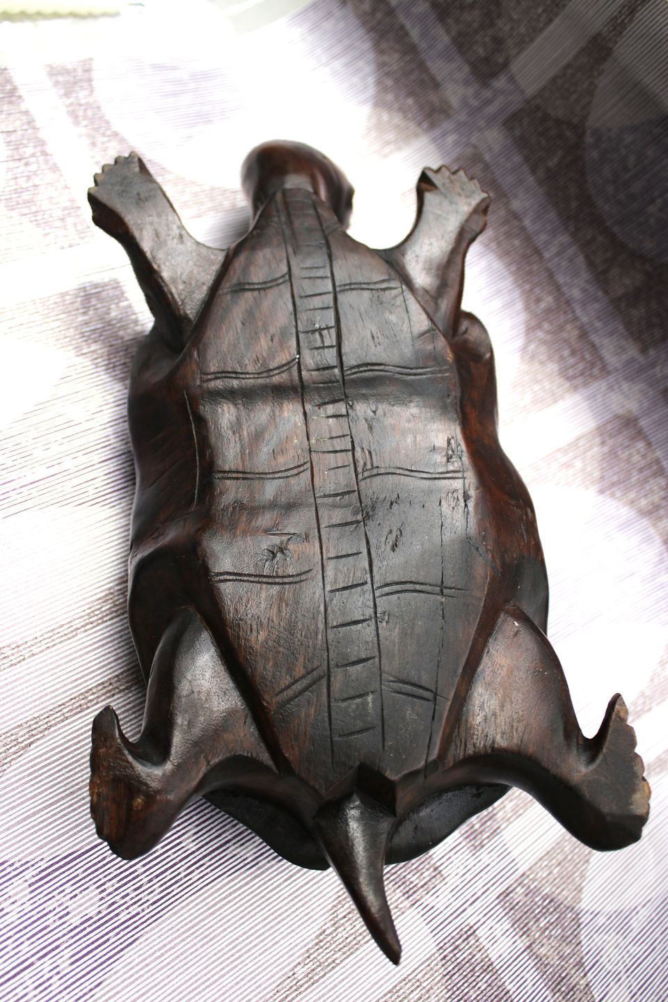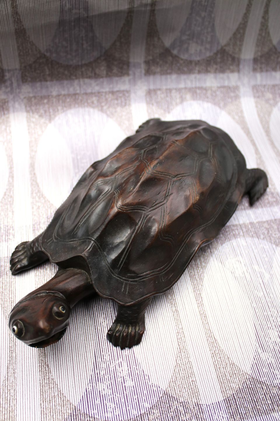 Gammel skildpadde udskåret i massivt mørkt træ med en rigtig fin patina. H: 7,5cm. L: 30cm. B: 15cm.