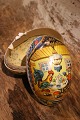 Gammelt vintage påskeæg i papmache med motiv af påskehare og høne der drikker te sammen. Højde: 12cm.