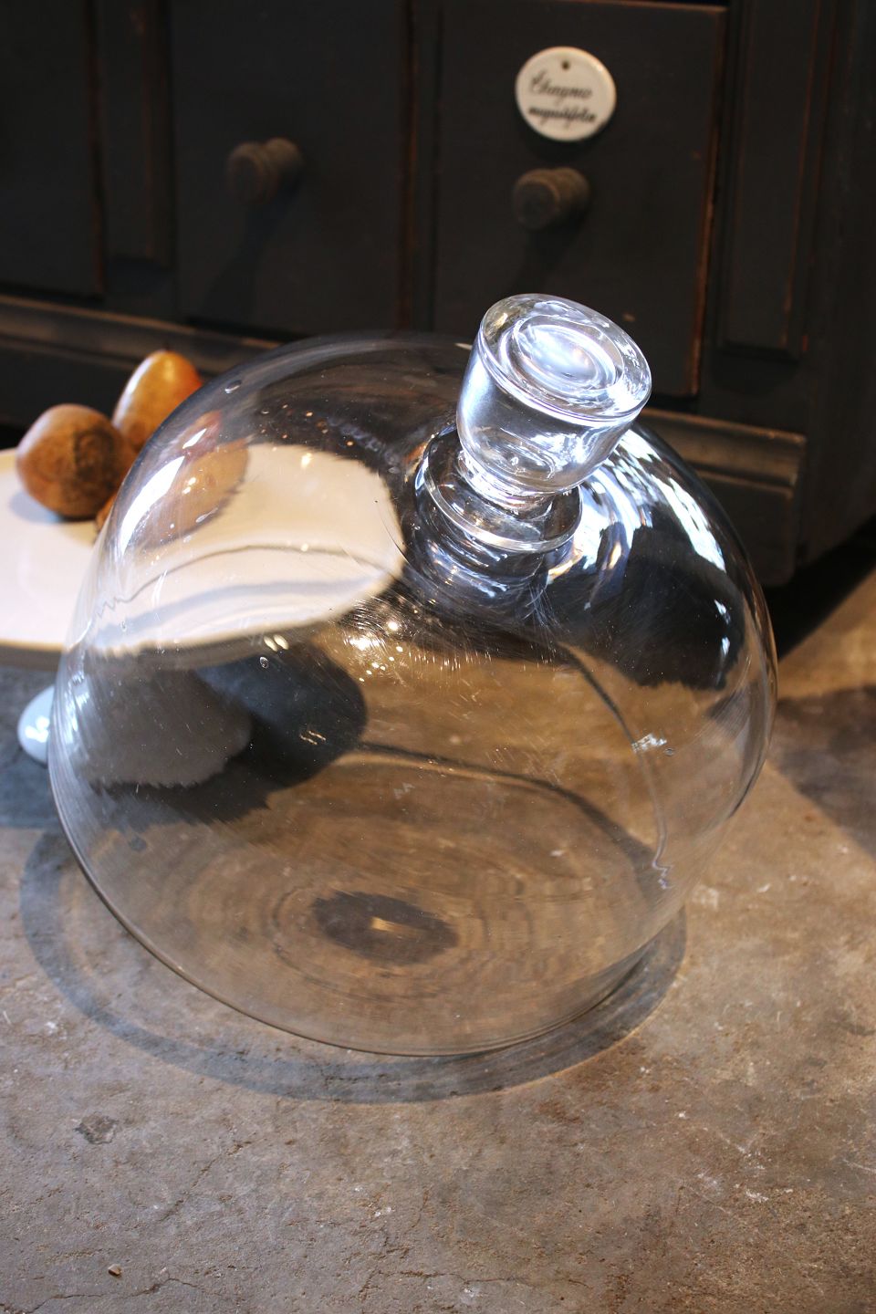 Stor , gammel mundblæst glasklokke med knop. H:27cm. Dia.:29cm. ( Sælges uden underfad i fajance ) Emne nummer: Glas klokke nr.2