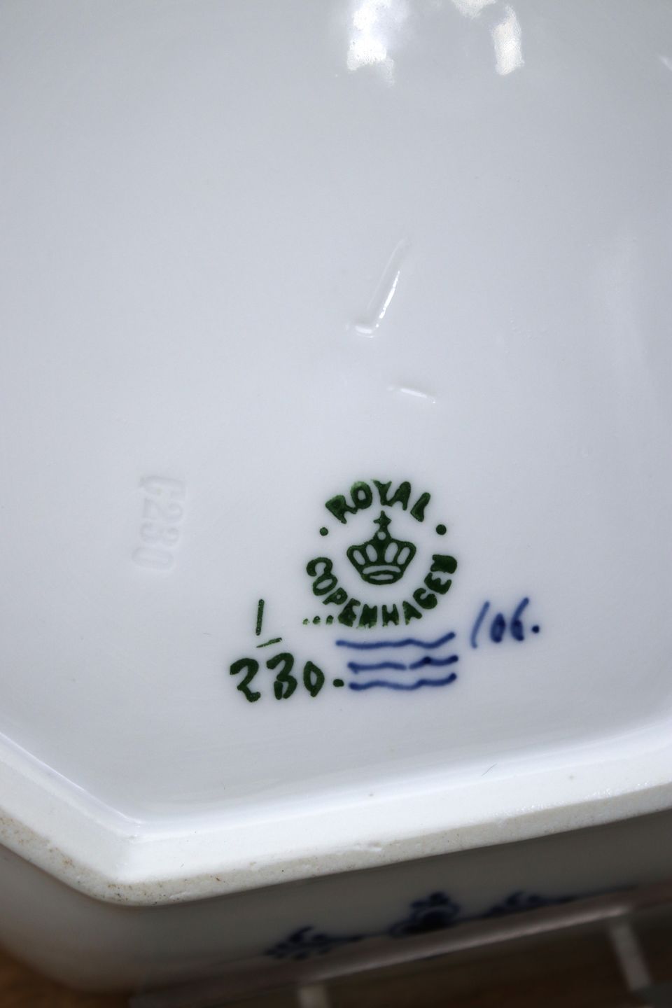 8 kantet sættefad i Musselmalet Riflet fra Royal Copenhagen. Dekorationsnummer: 1/230. 14,5x14,5cm. 1.sort. fra 1898-1923.