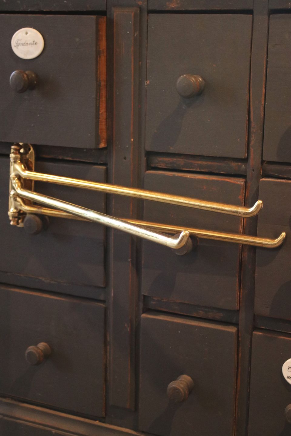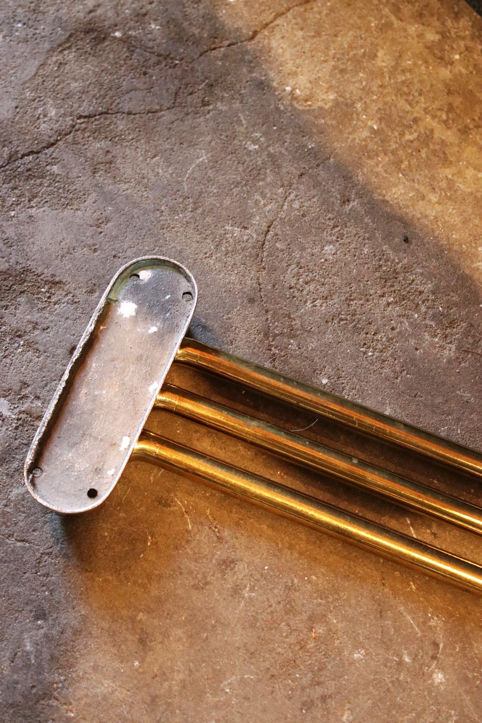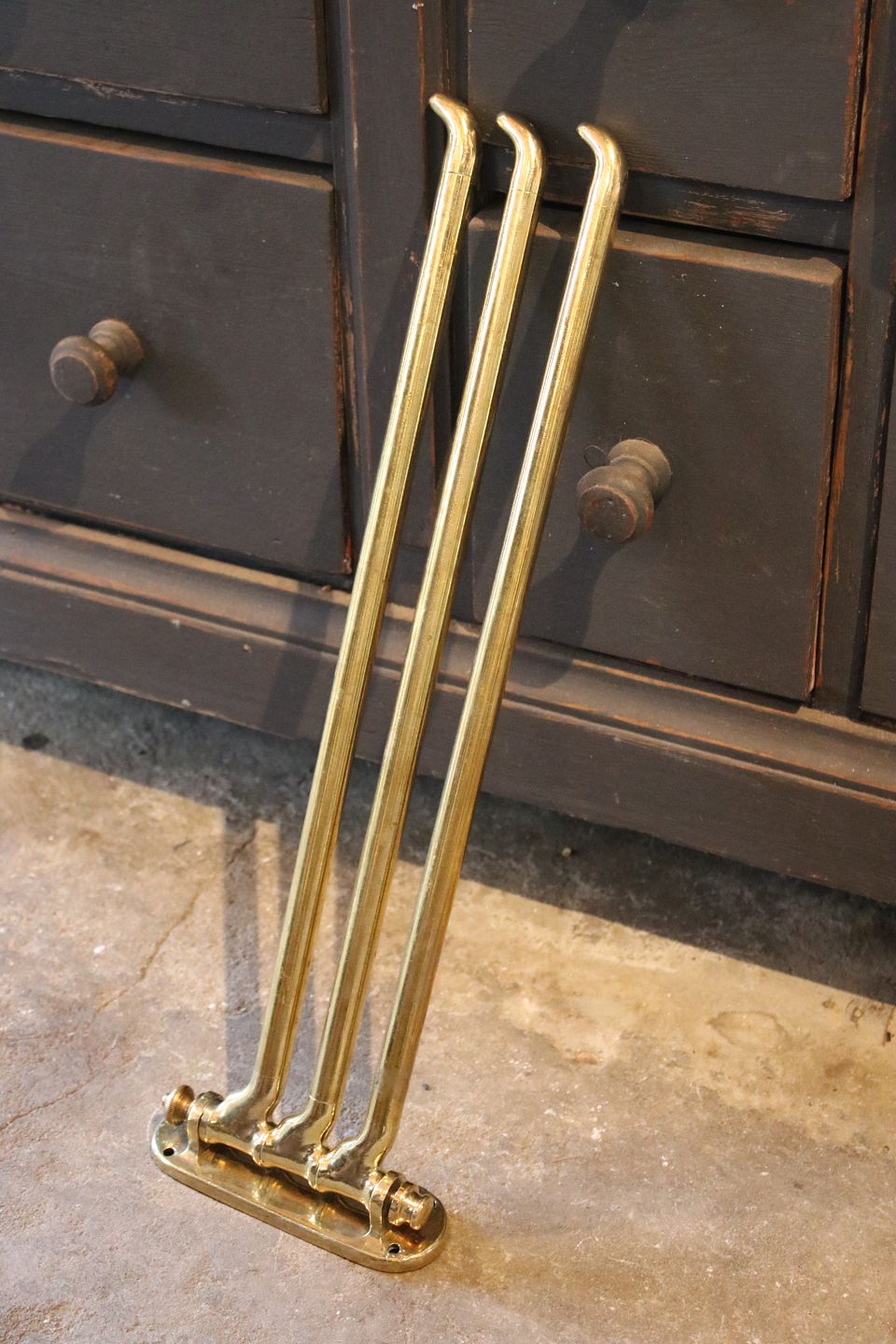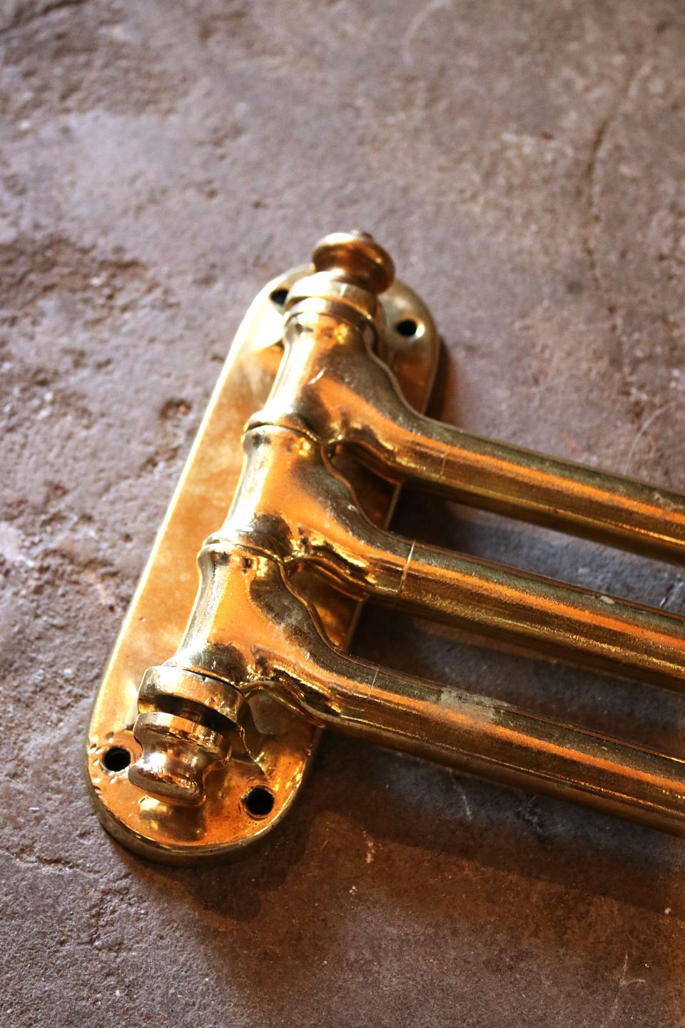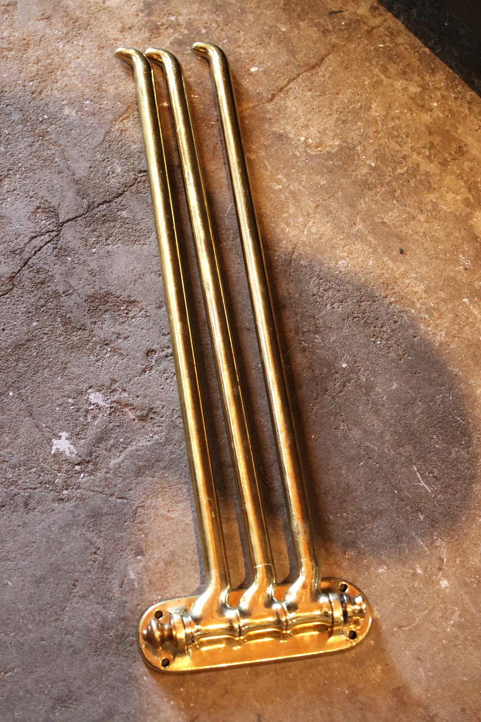 Gammel fransk væghængt håndklæde holder i massiv messing med fin patina. H: 15cm. L: 49cm. Emne nummer: Håndklæde holder 1