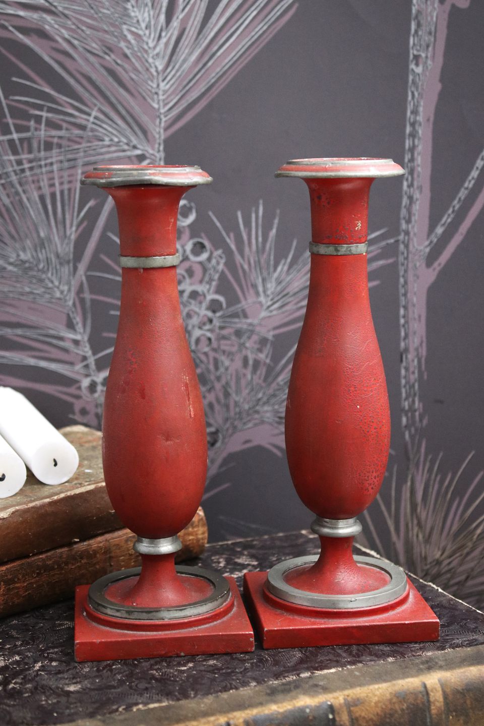 Et par Augustenborg tinstager fra omkring år 1840 med rød original bemaling. Højde: 21cm. Emne nummer: Augustenborg tinstager