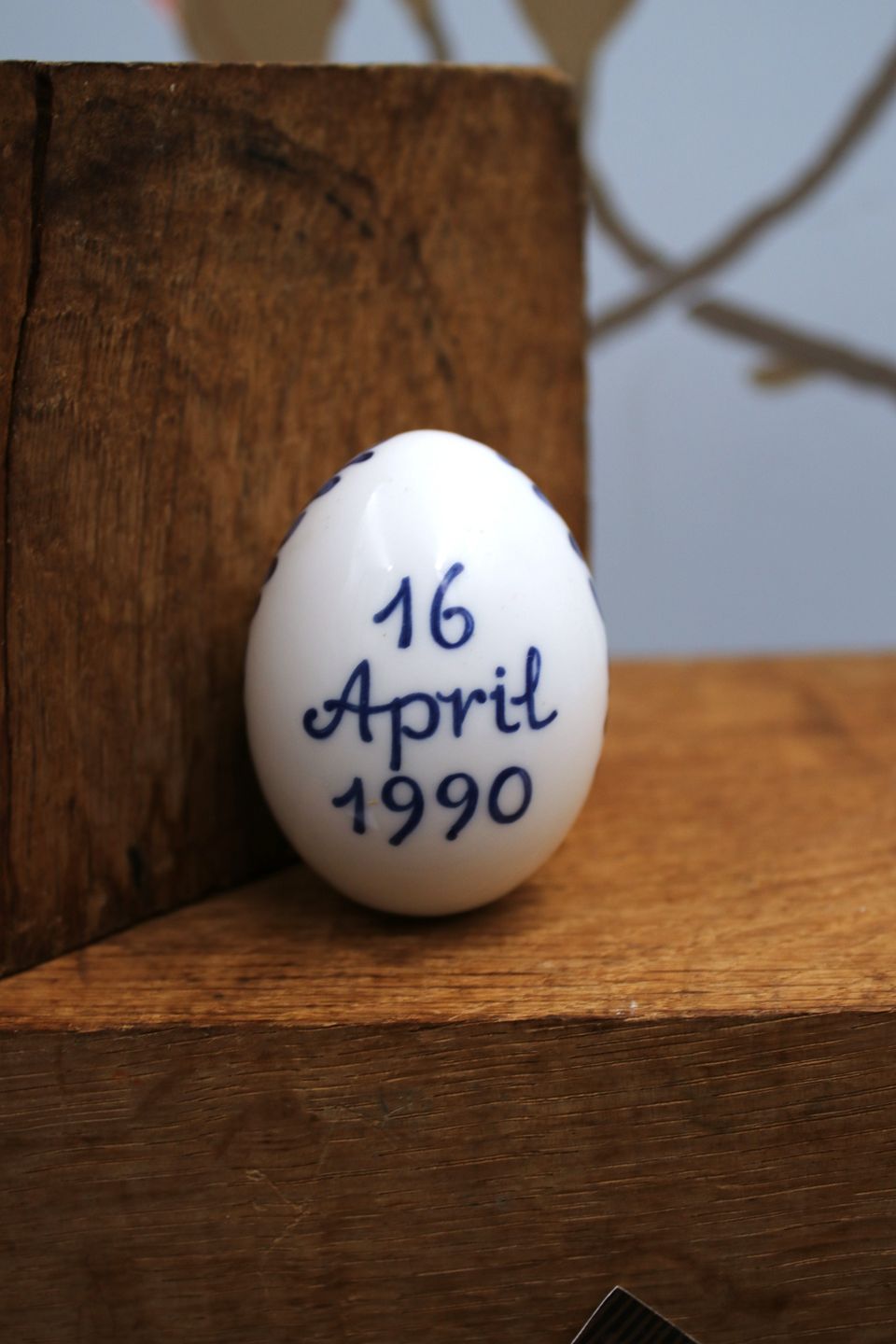 Royal Copenhagen porcelæns æg med Dronning Magrethe II monogram og inskription 16. april 1990 , lavet i forbindelse med Dronningens 50 års fødselsdag. H: 6cm. Dia.: 4,5cm.