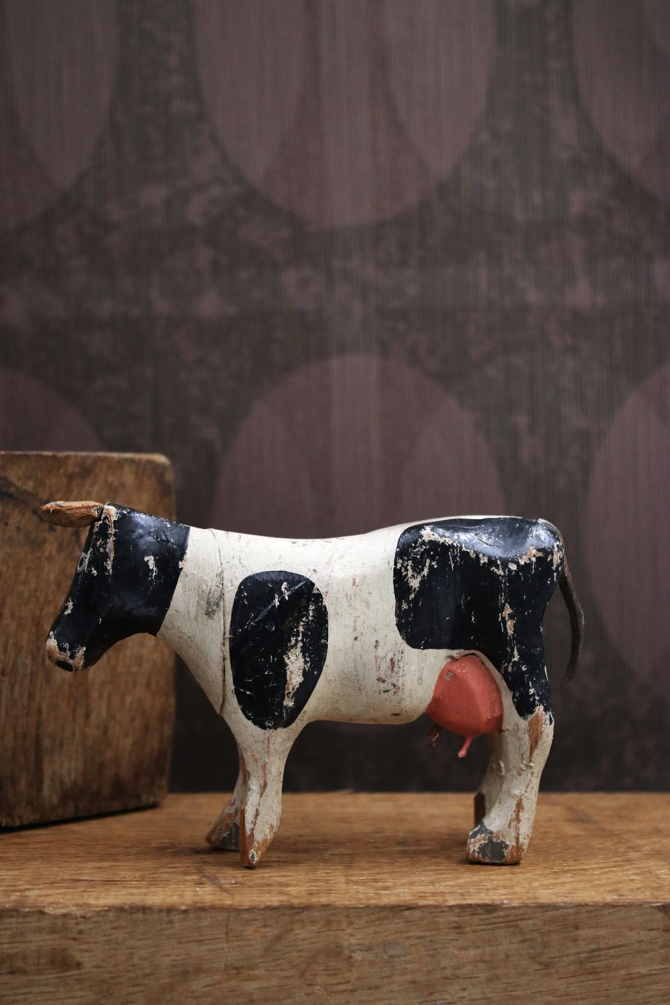 Dekorativ , gammel malkeko i udskåret træ med fin original bemaling , horn og hale i læder. H: 9cm. L: 13,5cm.