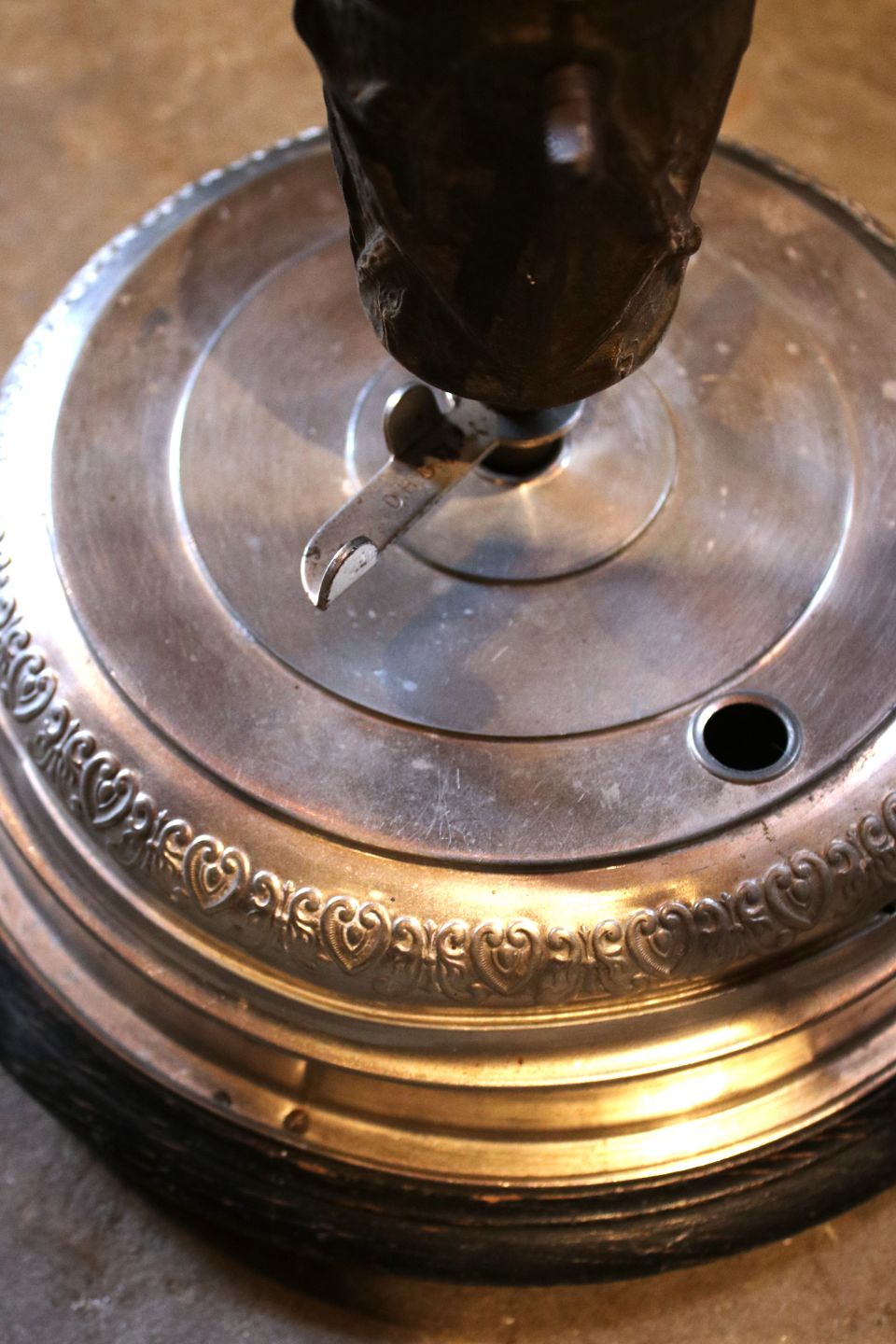 Gammel tysk mekanisk (med optræk) juletræsfod fra omkring år 1900