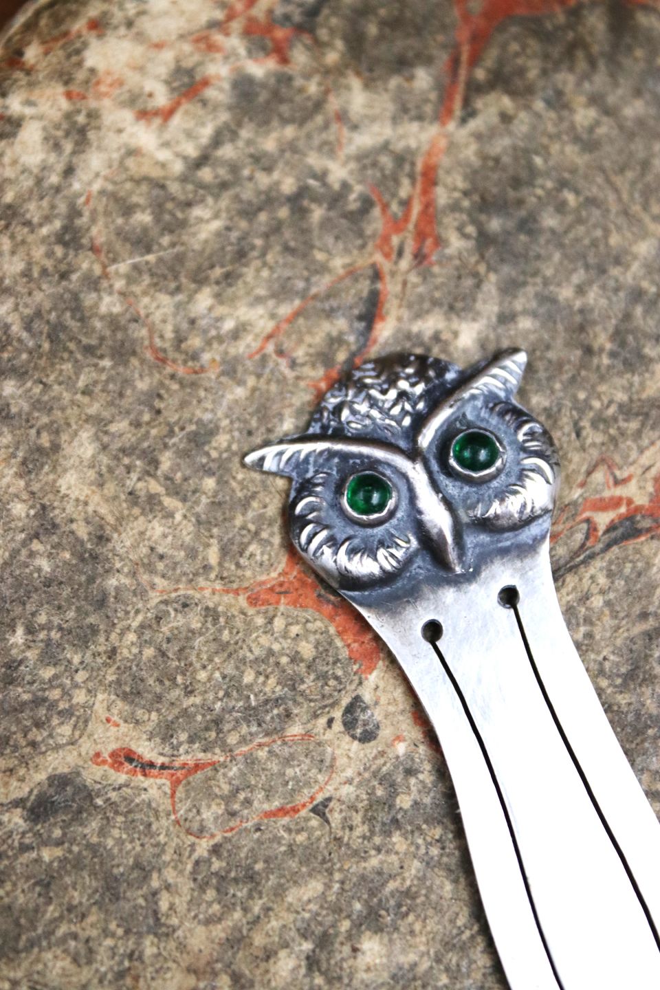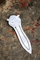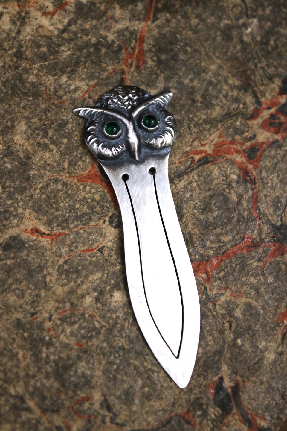 Gammelt bogmærke i sølv i form af en lille ugle med grønne glas øjne. Stemplet 830s. Længde: 5,8cm. Emne nummer: Bogmærke nr.4