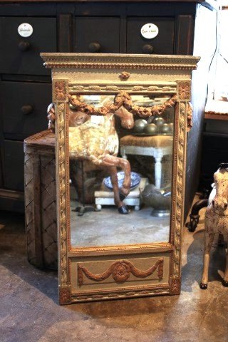 Swedish mirror in Gustavian style from around 1840 with fine decorated frame in delicate gray / green color and with original mirror glass.