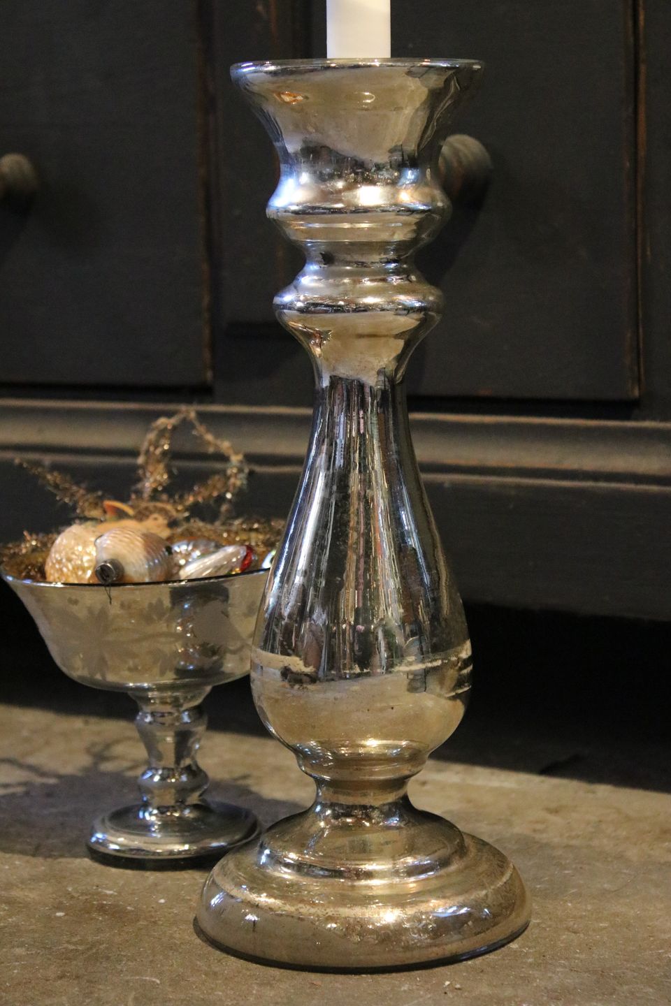 LARGE antique French 19th century candlestick in poor man's silver with fine patina. Height: 32cm. (Mercury silver glass) Item number: Stage nr.10