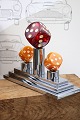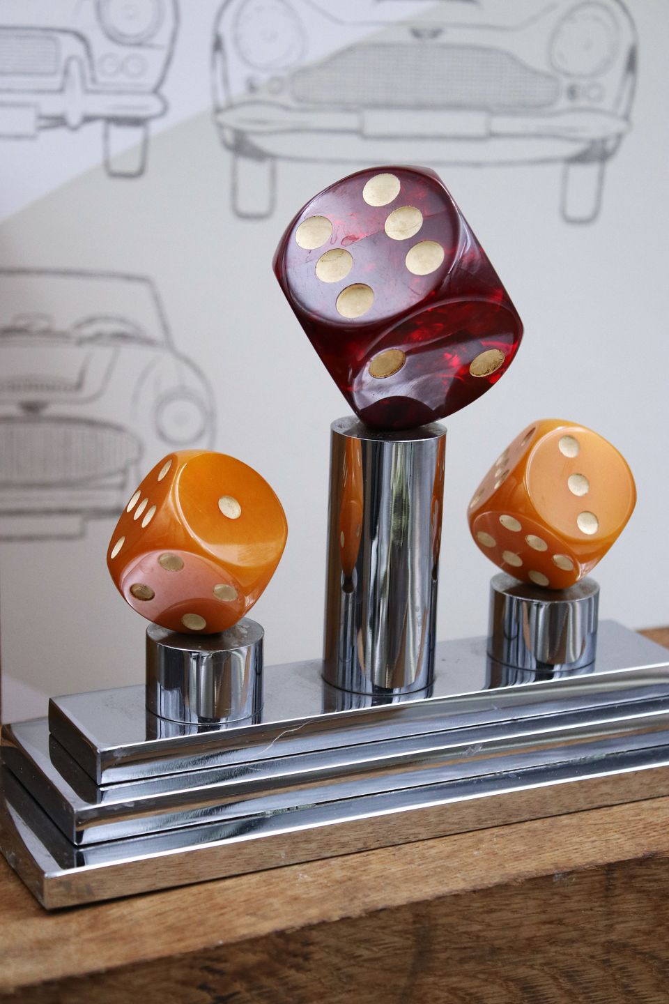 Decorative, old game trophy in chrome with 3 large dice in colored acrylic. H: 17cm. L&W: 21x8cm. (Weighs 3.5 kg.) Item number: Spille pokal