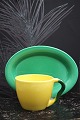 Ursula coffee cup in faience from Royal Copenhagen designed by Ursula Munch-Petersen, coffee cup in yellow glaze with green handle