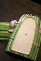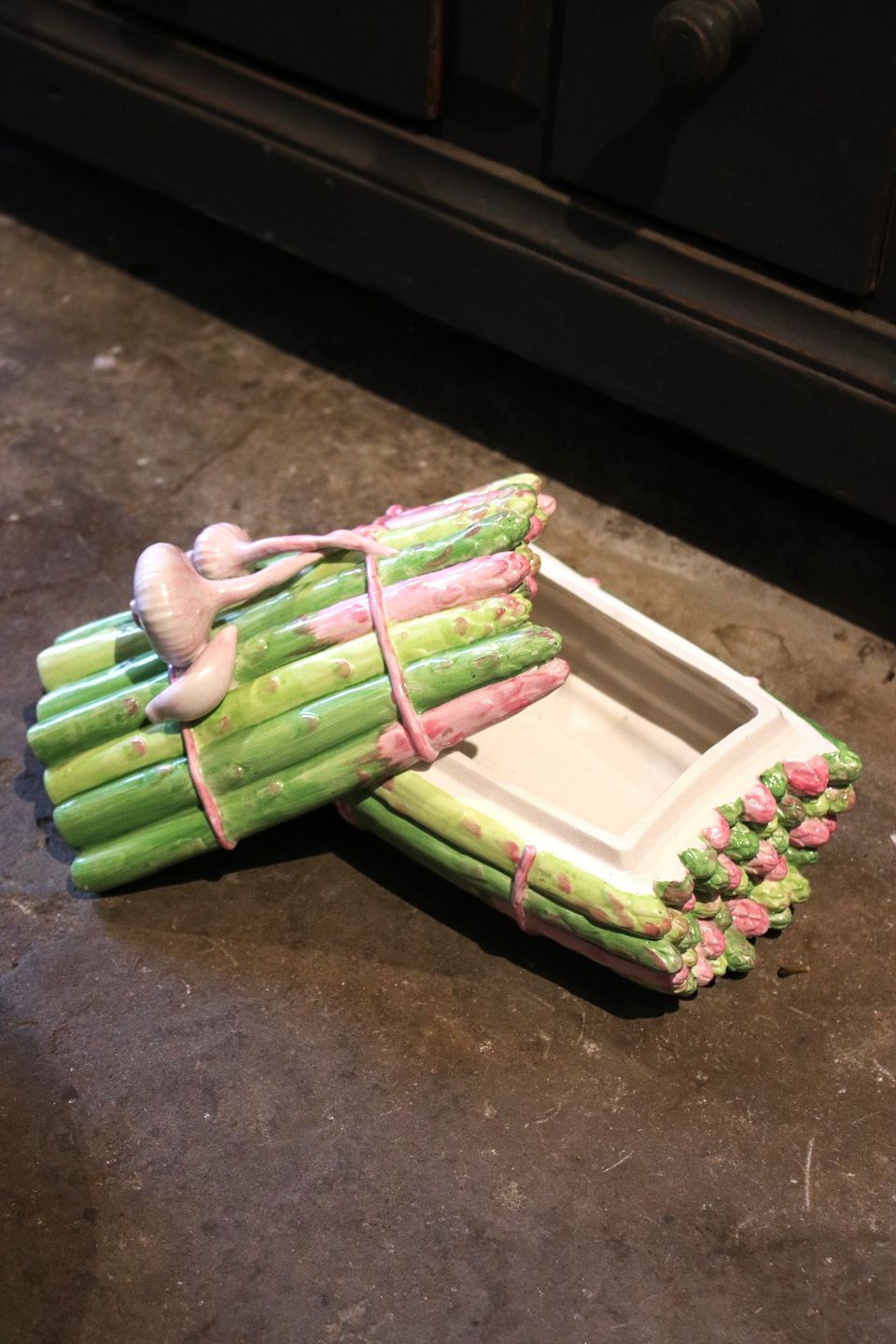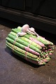 Old, Italian faience lidded jar in the shape of a bunch of asparagus with garlic on top. H: 18cm. L: 24cm. W: 16.5cm.