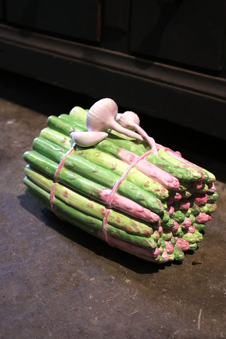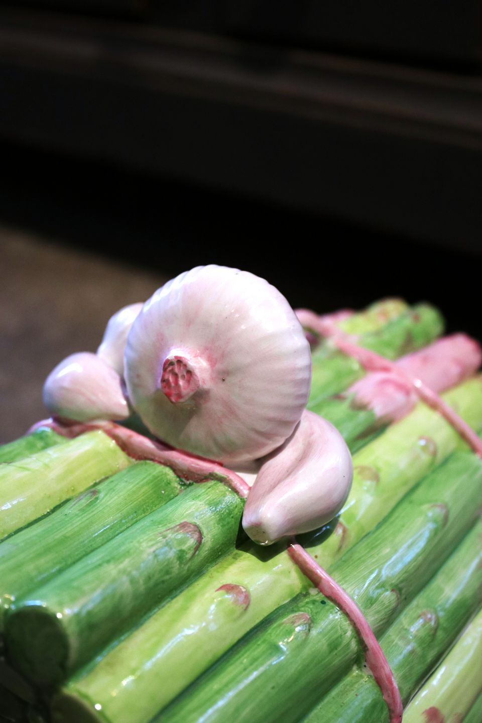 Old, Italian faience lidded jar in the shape of a bunch of asparagus with garlic on top...