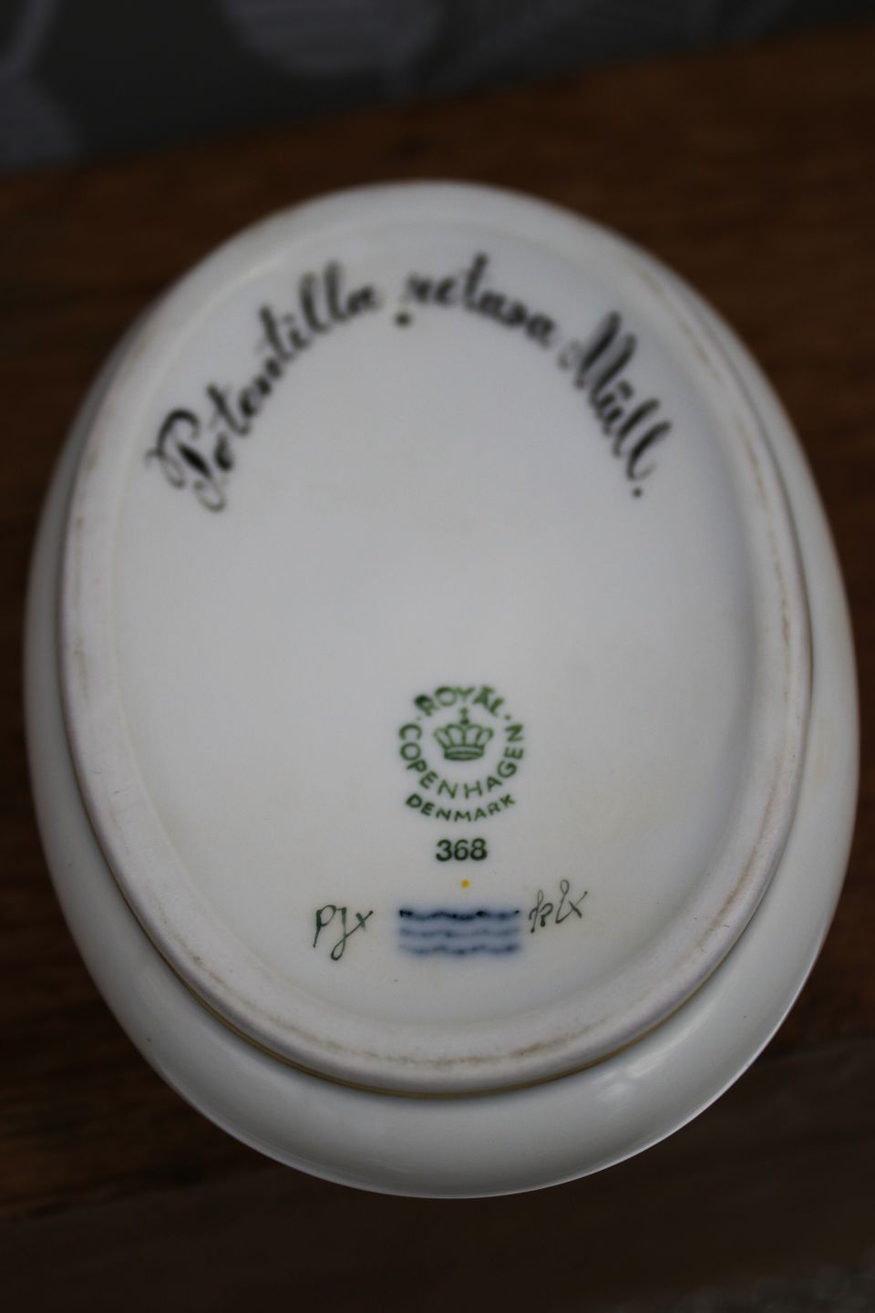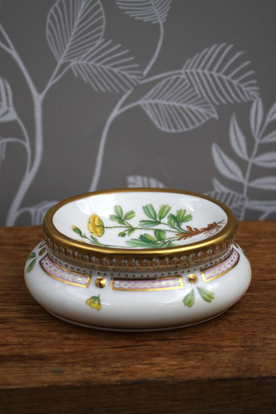 Salt cellar in Flora Danica frame produced by Royal Copenhagen in Denmark. Decoration number: 368. 1.sort. H: 4.5cm. 10.5x8 cm.