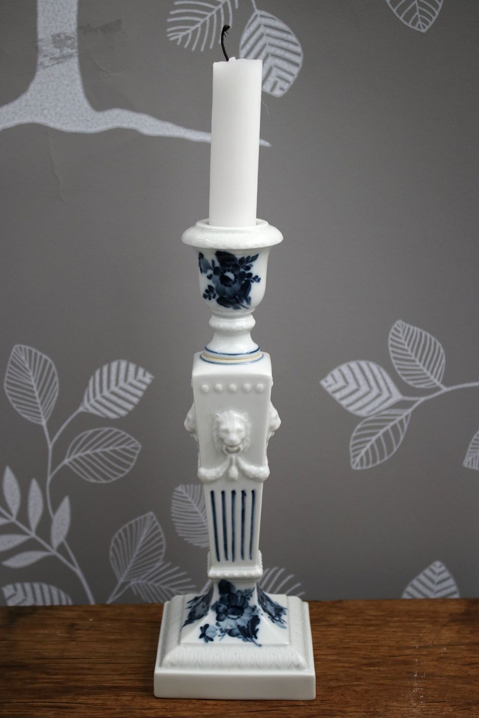 Lion candlestick in Blue Flower from Royal Copenhagen, with lion heads on the side. H: 22.5cm. Decoration number: 45/15. 1.sorting.