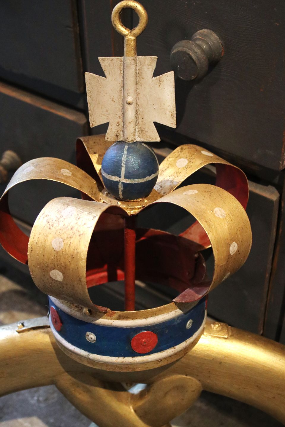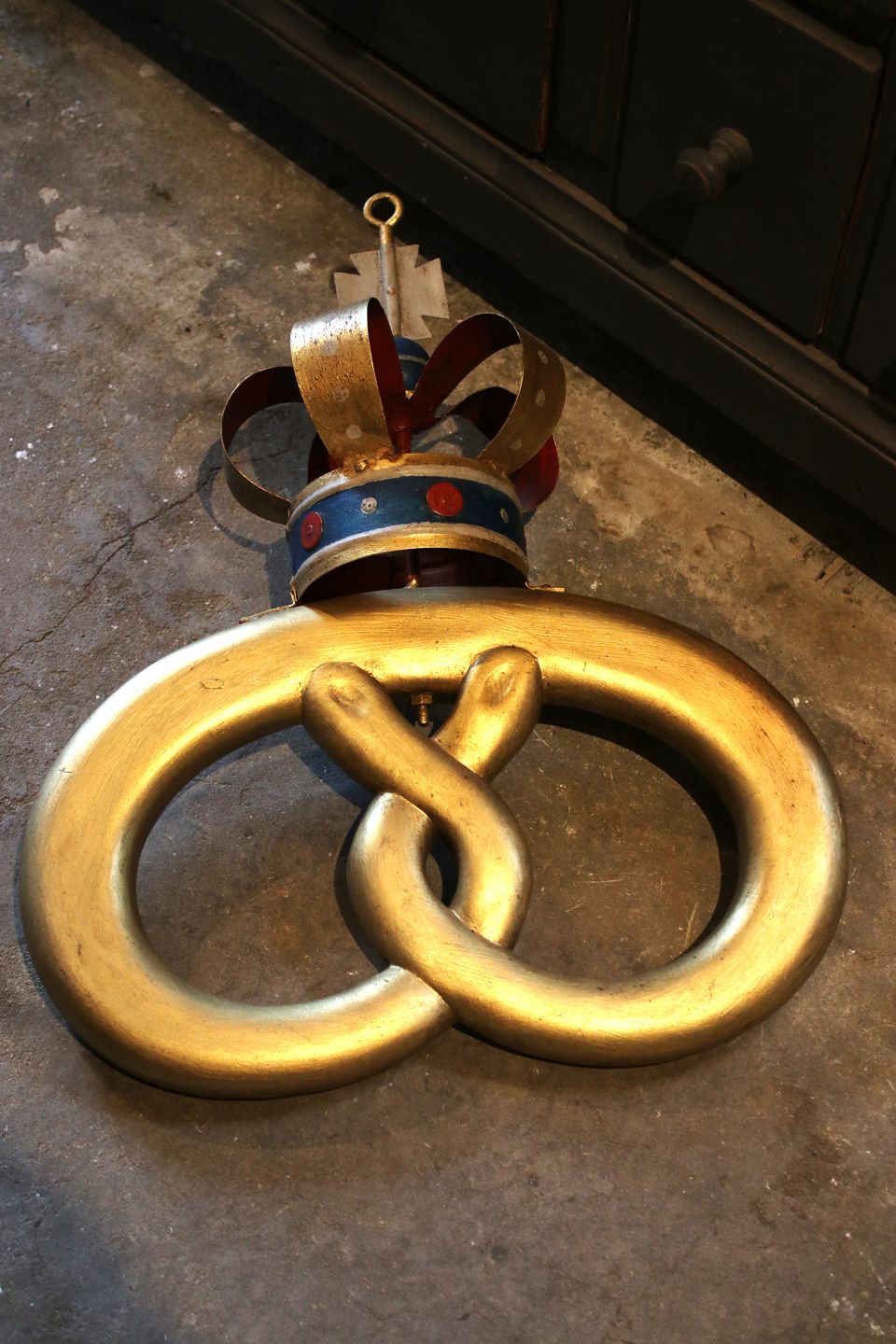 Old baker's sign shaped like a pretzel, gilded with a metal crown.
