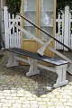 Gammel langbænk i træ , gråmalet med sort sæde og med fin patina. ( 1 stk. haves ) Måler : H:46cm. L:178cm. B:31cm.
