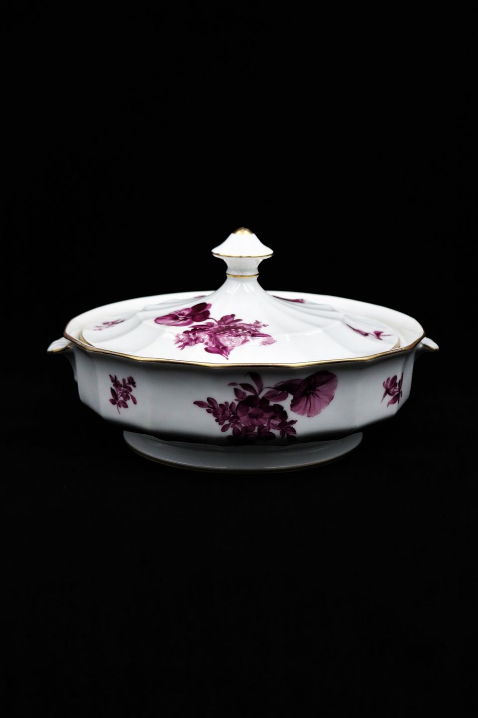 Sjælden Royal Copenhagen rund skål med låg og hanke i Purpur Blomst -