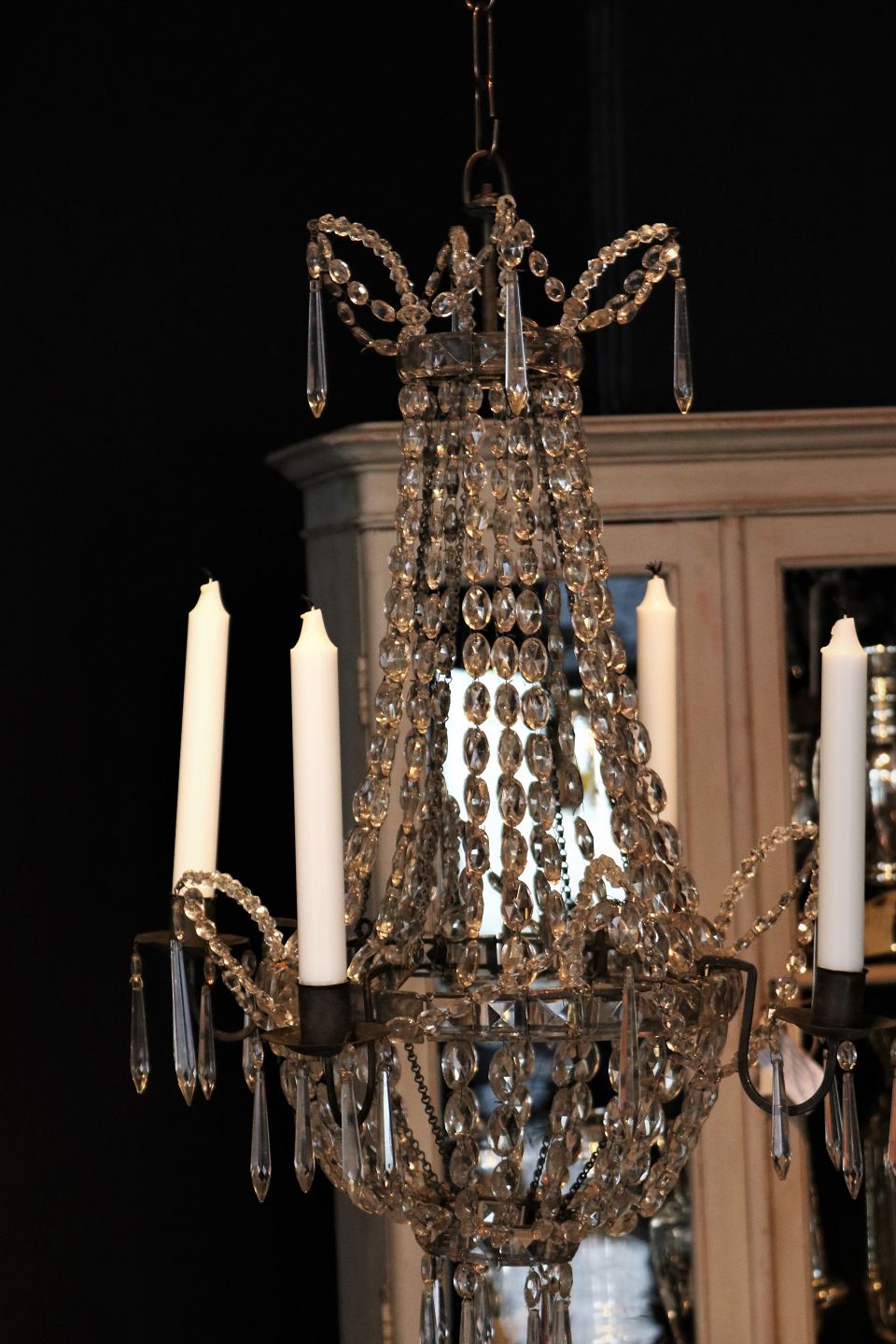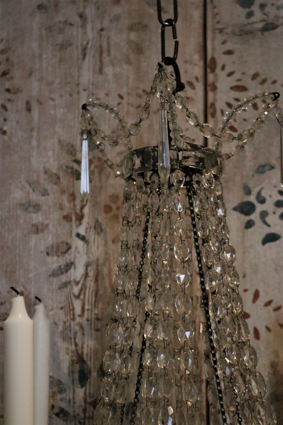 Fin , gammel prismelysekrone kun til stearinlys fra omkring år 1900 , dekoreret med masser af fine klar glas prismer og glas perler.
