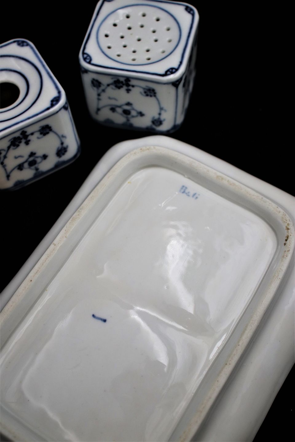 Antikt Bing & Grøndahl Blå Malet blæk skrive sæt , bestående af beholder til blæk og sand , samt underfad. Fra år 1853-94....