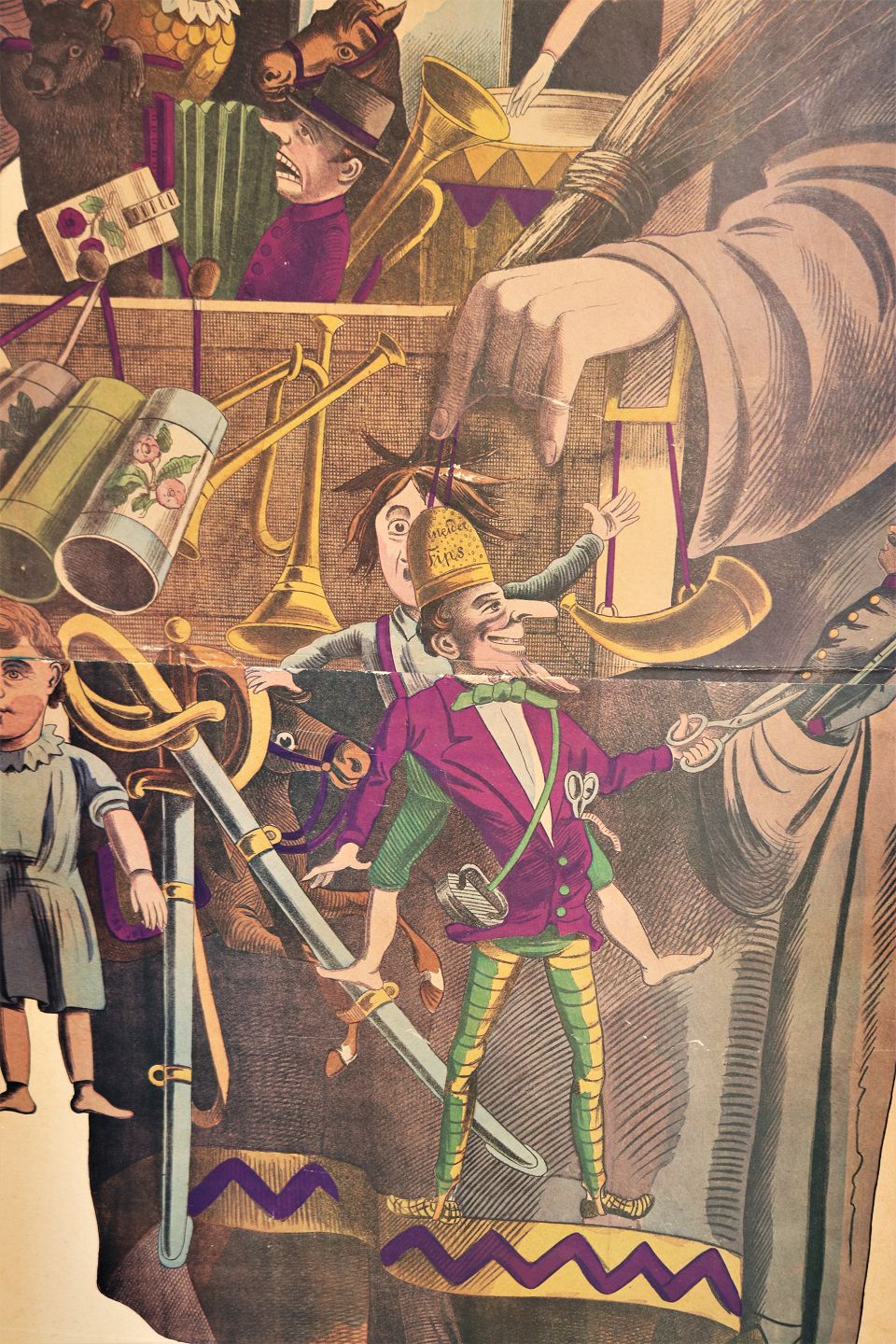Dekorativ , gammel jule planche ( tapet på pap og træ ramme ) med julemands motiv med sæk og julegaver.