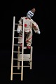 Gammel fransk cirkus legetøjs klovn i bemalet træ med klovnetøj i stof , samt stol og stige i træ som han kan stå på.