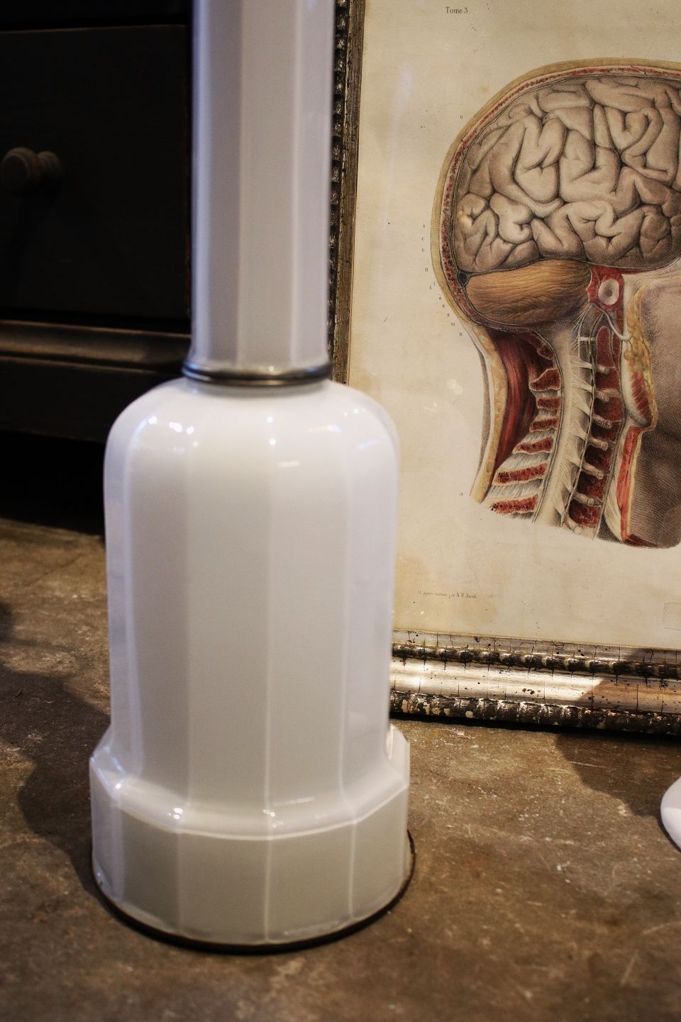 Gammel klassisk Heiberg lampe i hvid opalglas med hvid plisseret lampeskærm.