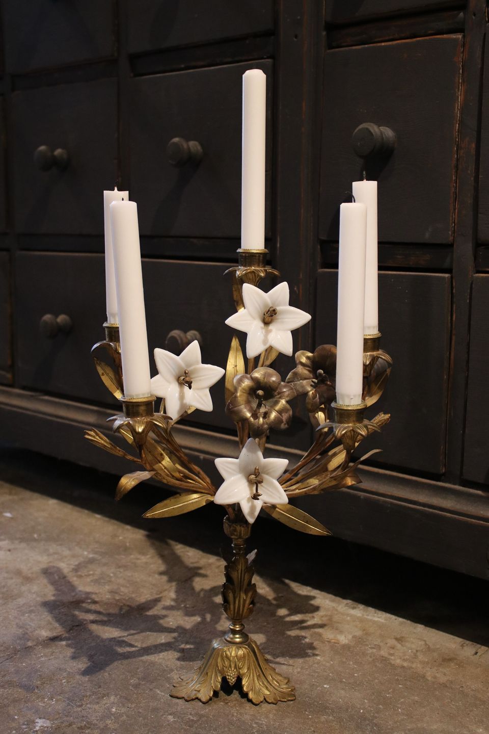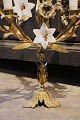 med plads til 5 stearinlys og dekoreret med 3 hvide opal glas blomster.